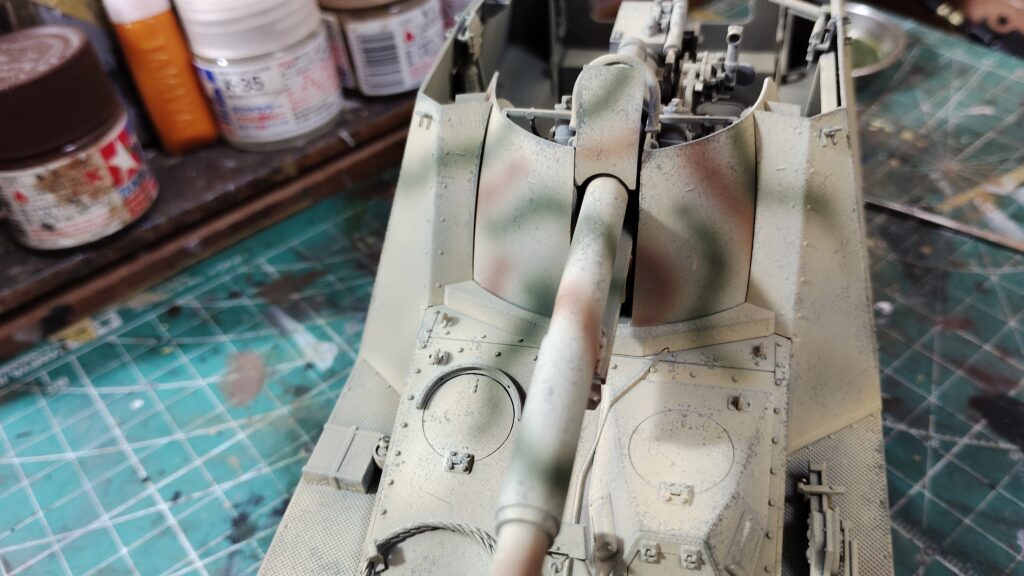 砲は取り付けた状態で迷彩塗装をしても問題ないですが、前面装甲板に隠れてしまう防盾部分の迷彩塗装が気になる人は、先に写真3、4のように砲を取り外した状態で迷彩塗装を行います。