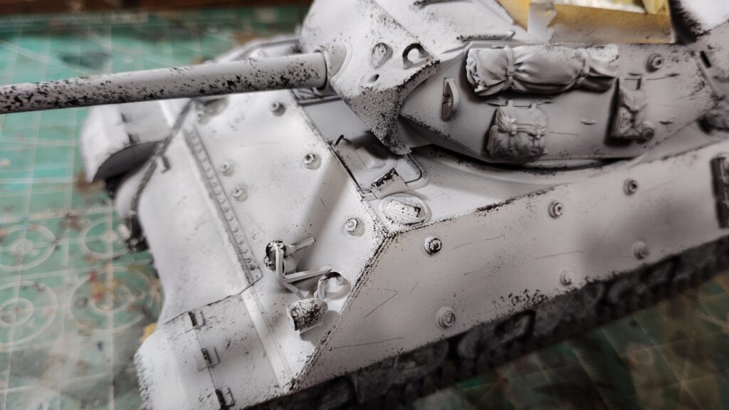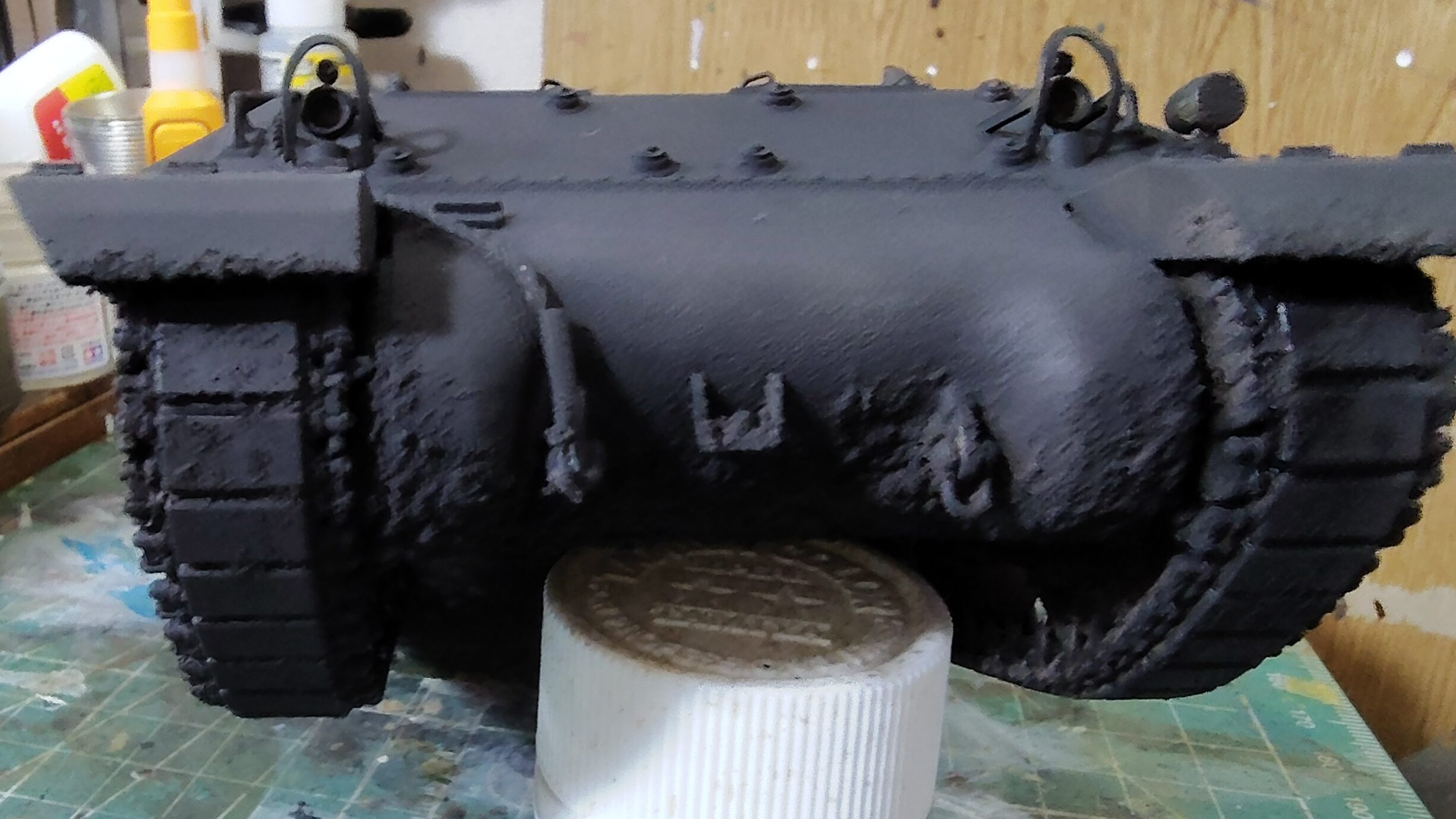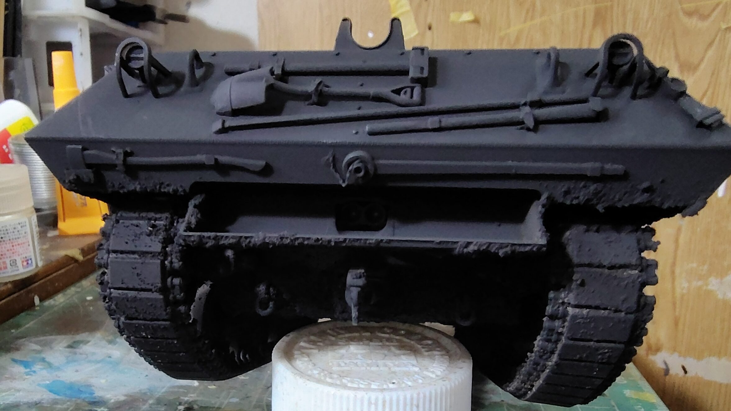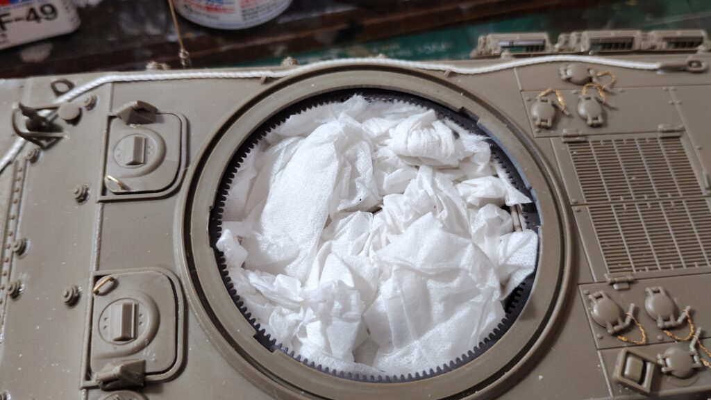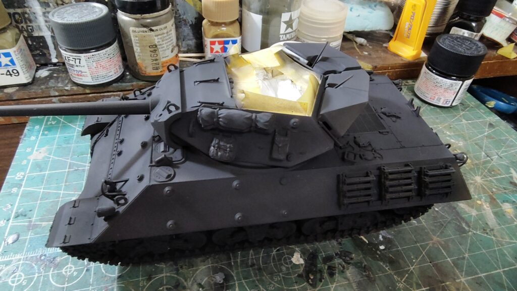 砲塔に取り付けた荷物にもしっかりと黒を吹き付けます。