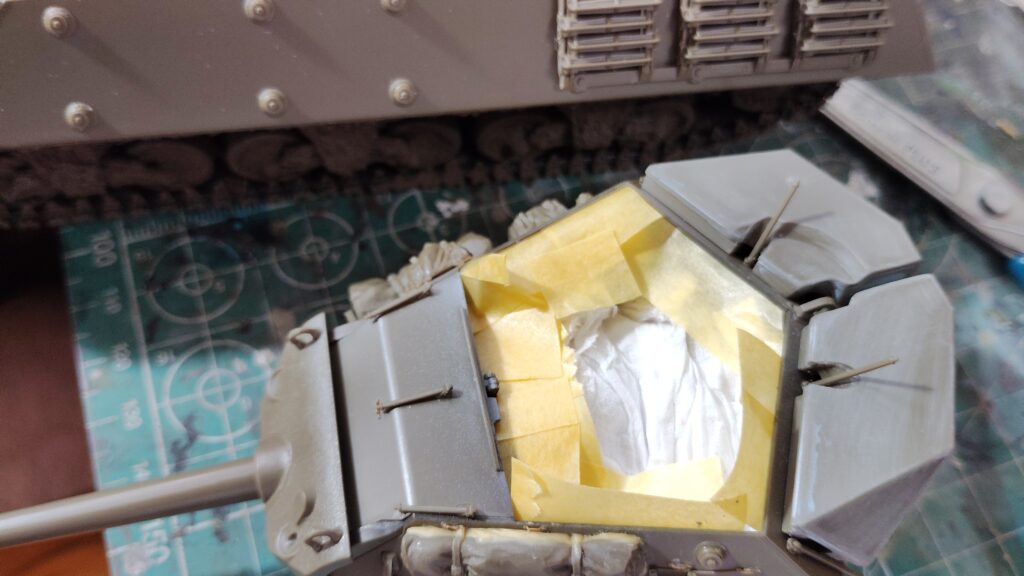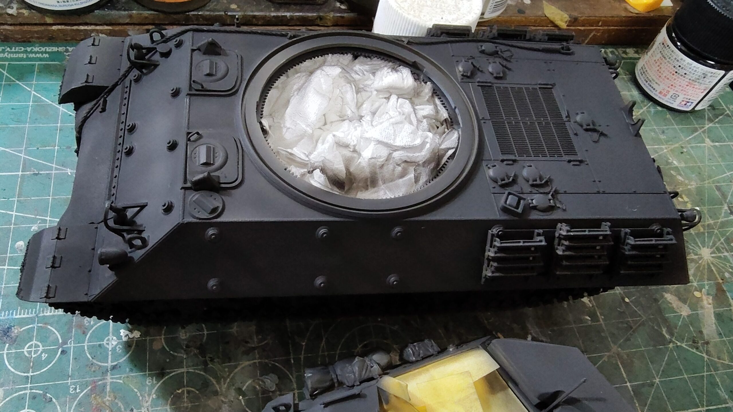 天板を取り付けると奥まった部分の塗装が難しくなるので、今回は砲塔内部の塗装を先にしましたが、天板で隠れる部分は完成後にはほとんど見えないので、マスキングが面倒な人は車体と一緒に砲塔内部の塗装をしても問題ないです。