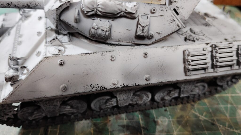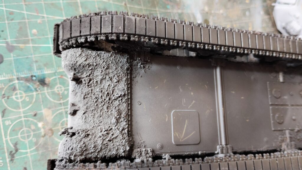 通常の下地塗装だと車体下部はほとんど黒が残った状態にするのですが、そうすると泥汚れ全体が暗い色味になってしまいます。特に車体色がジャーマングレイやオリーブドラブなどの濃い色の場合は、泥汚れが暗くなりやすいです。