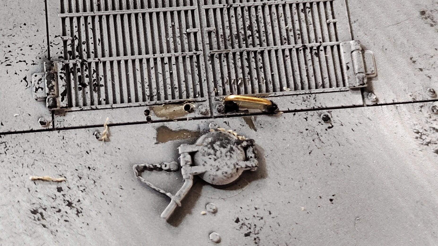 写真21のエンジングリル上にある突起はフックのモールドを省略したものになります。このまま製作しても問題ないのですが、砲塔のフックをエッチングに変更したので、この部分も真鍮線でフックを自作します。