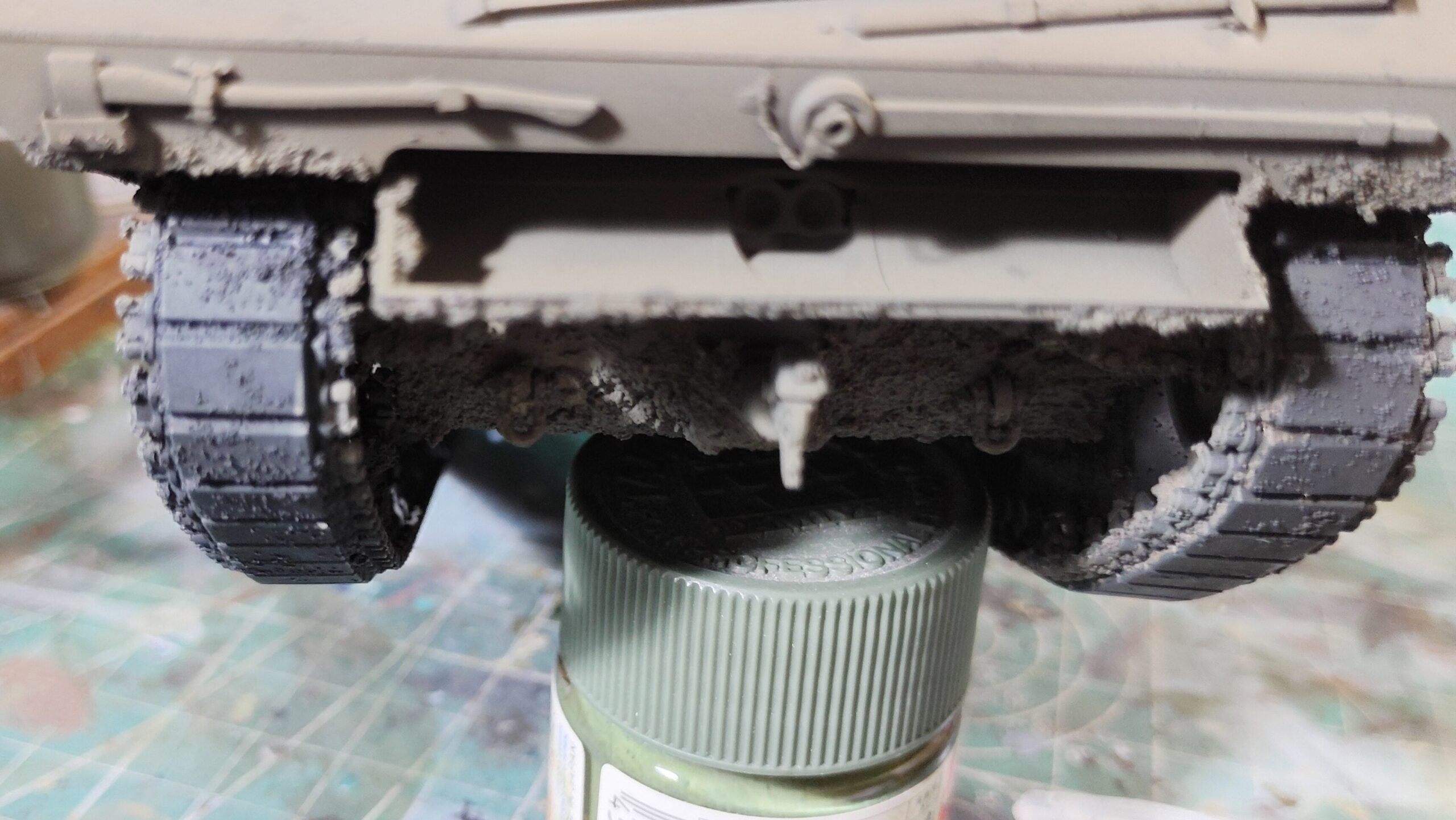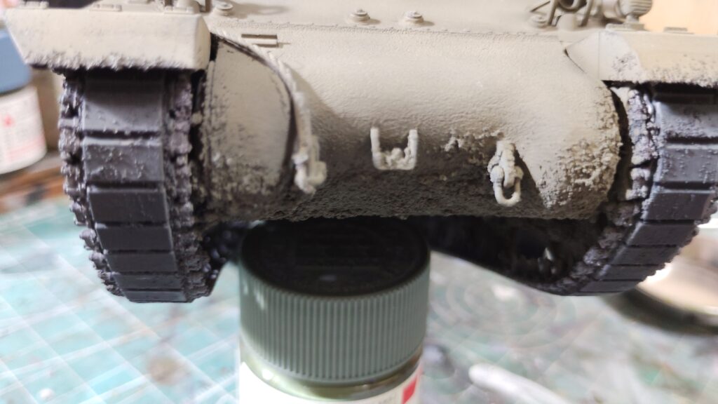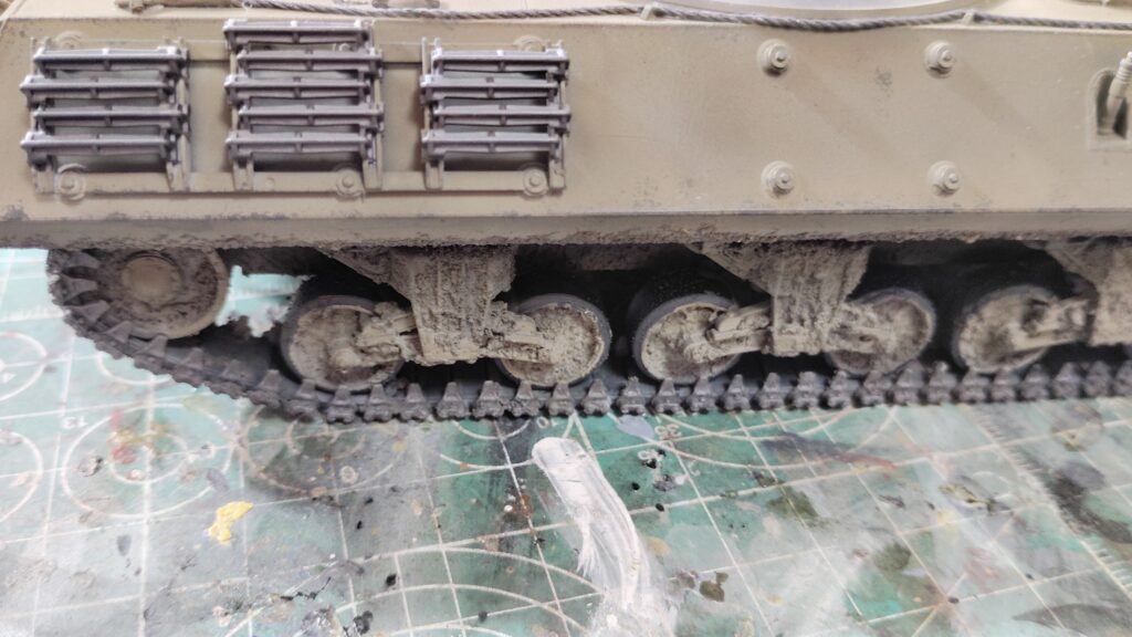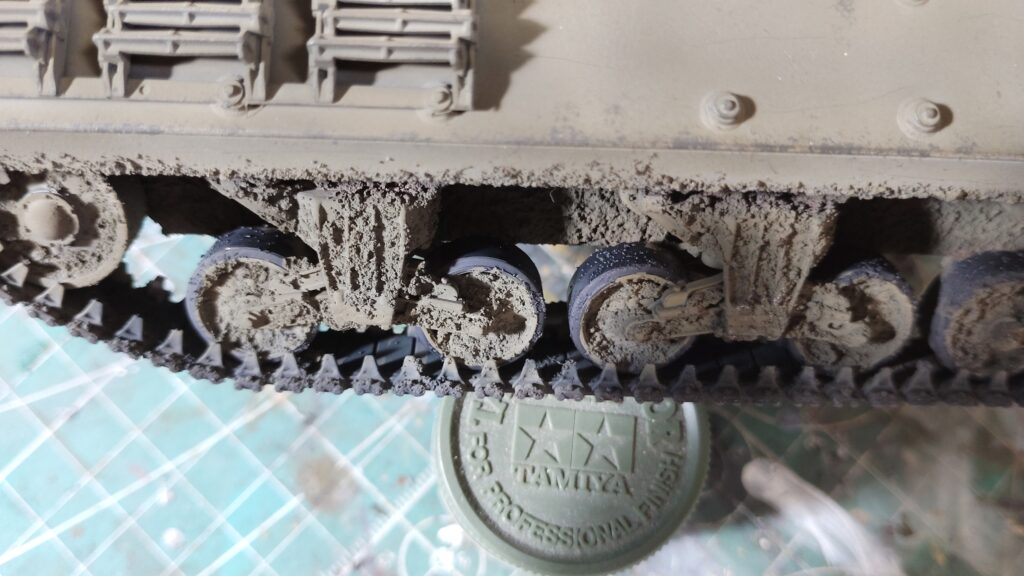 キャタピラの接地面などに付着させた細かい泥汚れは塗装が難しそうに感じますが、パステル粉の付着などを繰り返していくと、勝手に色が着いていくので意識して塗装をする必要がないです。細かい事は気にしないでキャタピラを塗り分けて下さい。