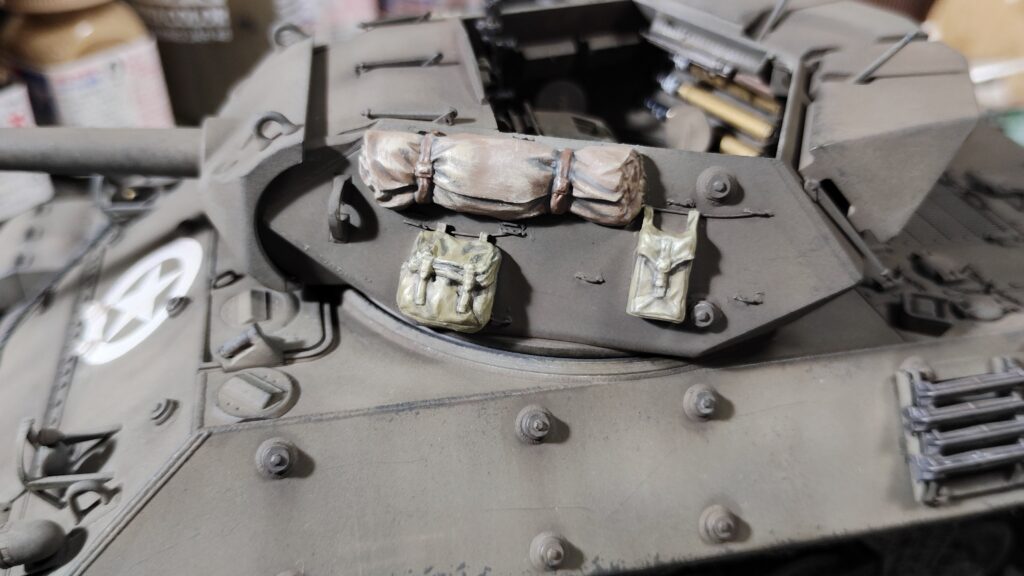 砲塔に取り付けた荷物に明暗を加えます。基本色に黒を加えた影色を凹部分に塗って、白を加えた明るい色でドライブラシをします。