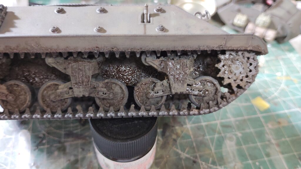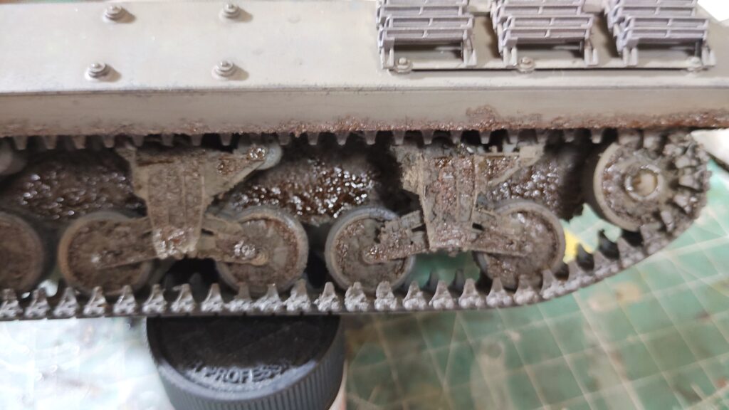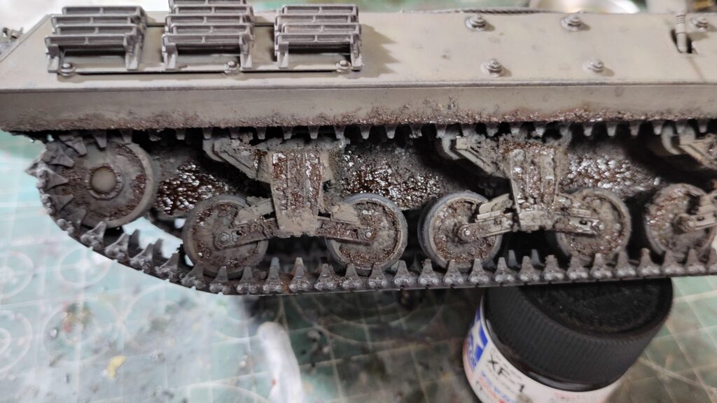 例えば乾いた泥汚れにしたいなら、前回行った泥汚れの塗装終了時にパステル粉を表面に軽く付着させれば終了だし、軽く湿らせた状態にしたいのなら、古いオイル汚れ用塗料を使用して泥を湿らせた状態で終了になります。