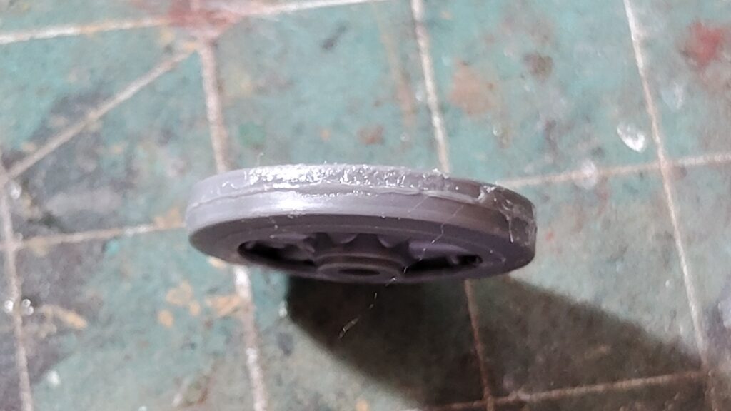 転輪は左右貼り合わせになるので中央に合わせ目が発生します。比較的目立たない場所のため、戦車の砲身のようにきれいにヤスリで処理する必要はないので、ナイフのカンナがけで合わせ目を処理します。
