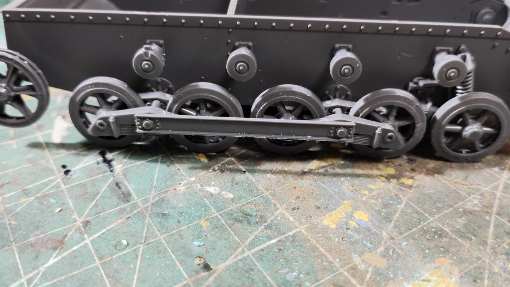 転輪アームの取り付け部分には接着ガイドがありますが、ほんの少しだけ遊びがあります。そのため、しっかり接着したつもりでも、転輪アームが若干ズレて転輪が浮いてしまう場合があります。