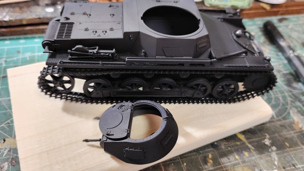 砲塔内部は白色なので砲塔内部にも白を吹き付けます。Ⅰ号戦車はハッチが大きく砲塔が小さいので筆が入りやすく、砲塔の組立て後でも塗装が可能です。