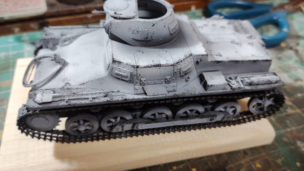 ジャーマングレイの車両は塗料剥がれ表現があまり目立たないです。目立たないからといって、黒色で傷や塗装剥がれを加えるとちょっとしつこい感じになってしまいます。