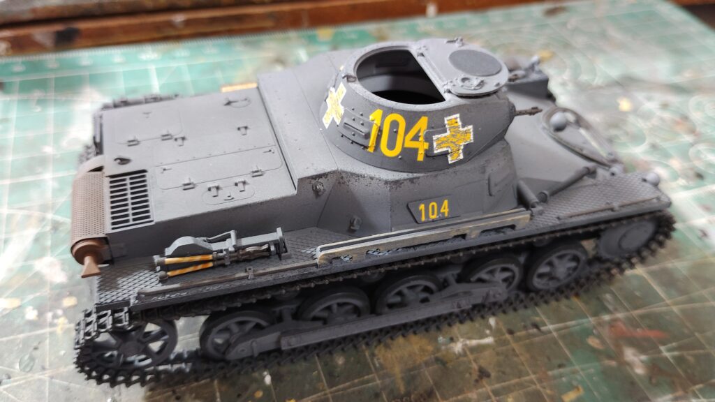 デカールを貼ります。貼る枚数は少ないですが、車体番号や国籍マークが砲塔の凹凸と重なるのでデカール軟化剤を使用して車体の凹凸に密着させます。