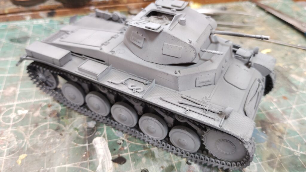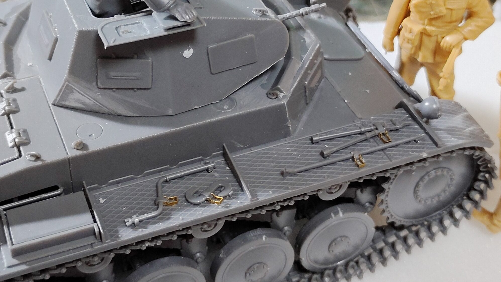 前回製作したⅠ号戦車よりもやや古いキットになりますが、キャタピラは部分連結式で、排気管の放熱板はエッチングパーツで再現されています。