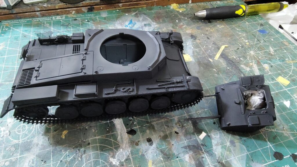 まずはタミヤアクリル塗料XF1フラットブラックで写真4のように塗装をします。塗り残しがないように全体に吹き付けます。砲塔内部はⅠ号戦車と異なりハッチが小さく筆が入りにくいので、事前に塗装してマスキングをしています。