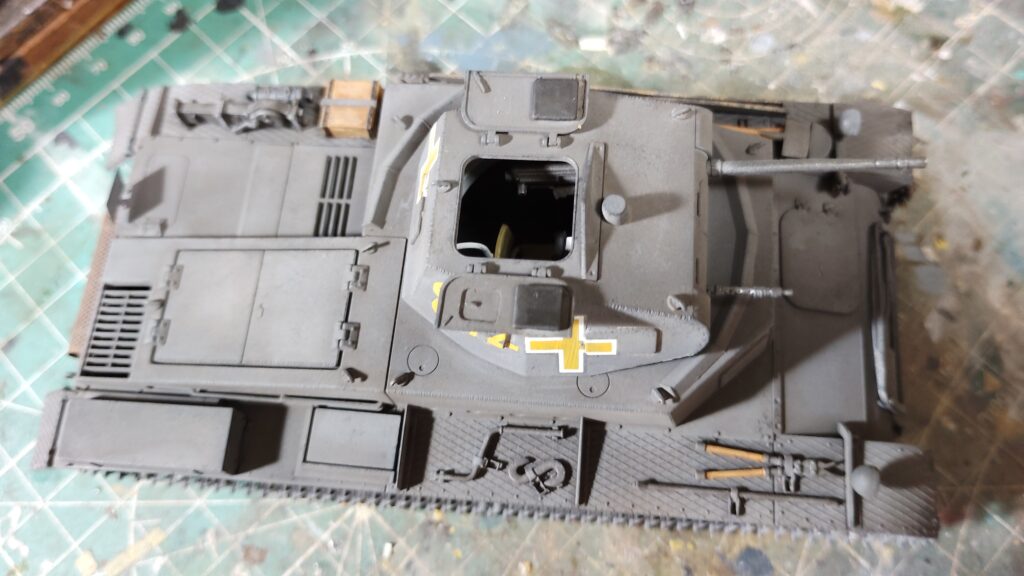 細部塗装とデカール貼りをします。砲塔部分はハッチなどの凹凸にかかるデカールがあるので、軟化剤を使用してデカール貼りを行います。