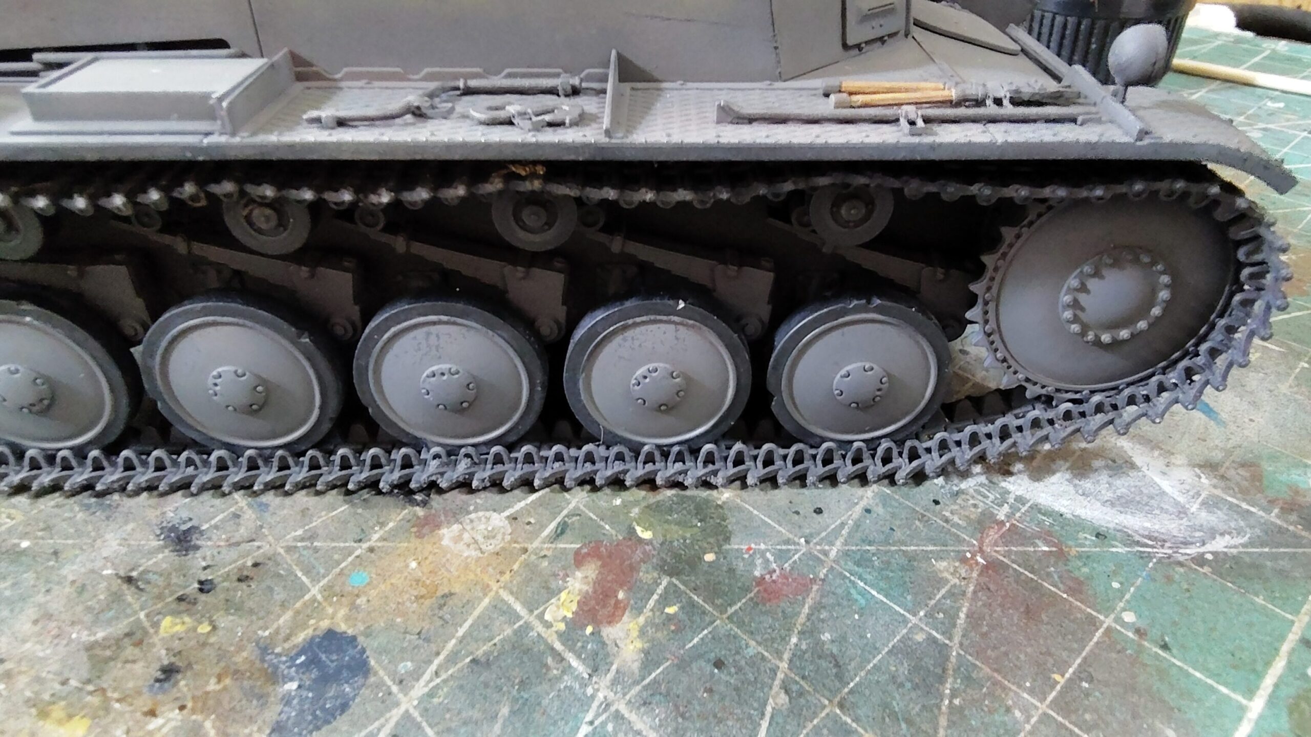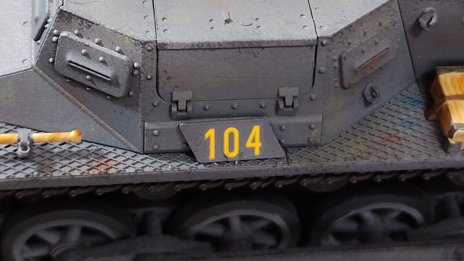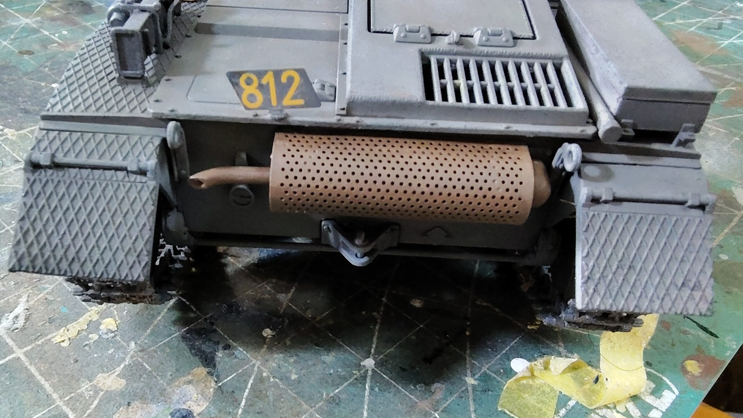 フェンダーにも油絵具もどき塗装を加えましたが、エナメル溶剤を先に塗ったため上手く拭き取れたようで、Ⅰ号戦車のように塗料がモールドに残る事は無かったです。排気管はパステル粉で汚すので油絵具もどき塗装は加えていないです。