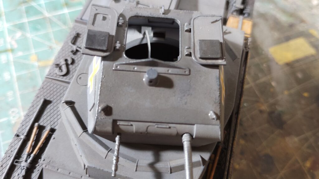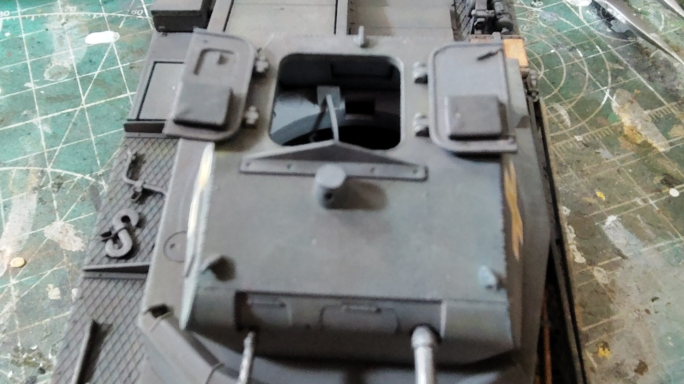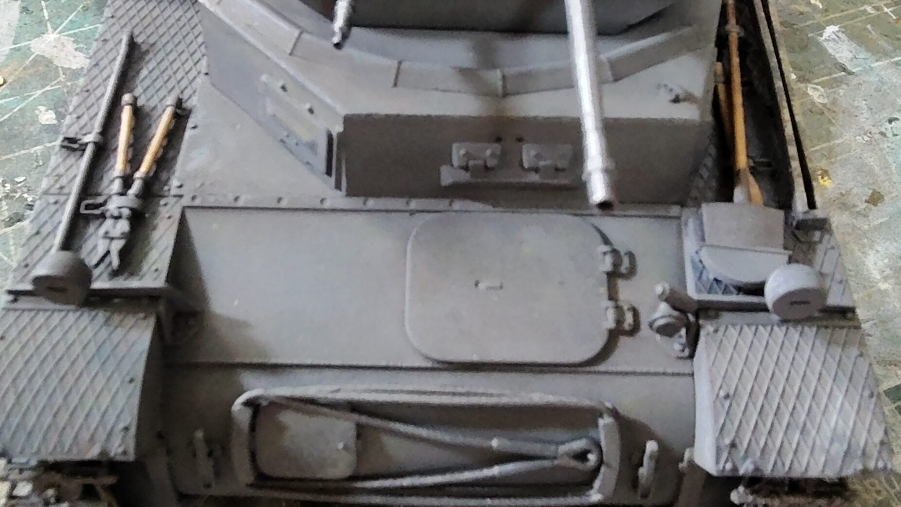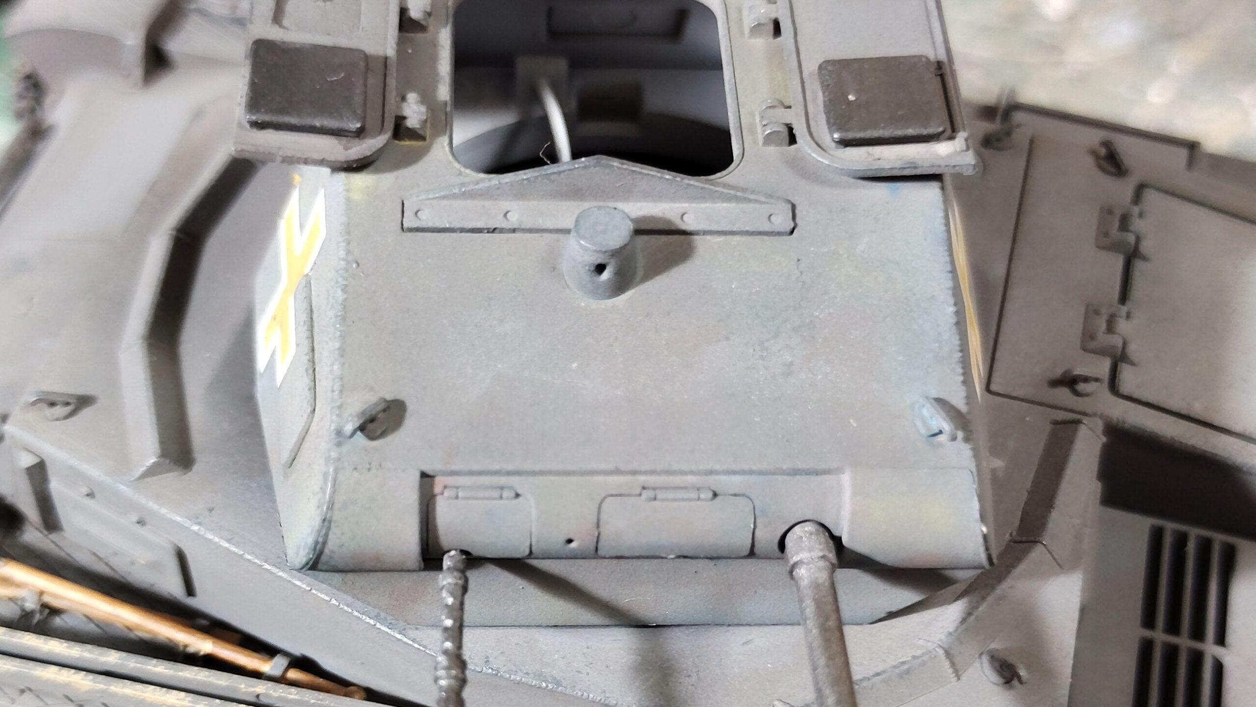 光を抑えて撮影したものが写真6、7になります。油絵具もどき塗装を加えた砲塔上面と、加えていない他の部分との違いが解ると思います。