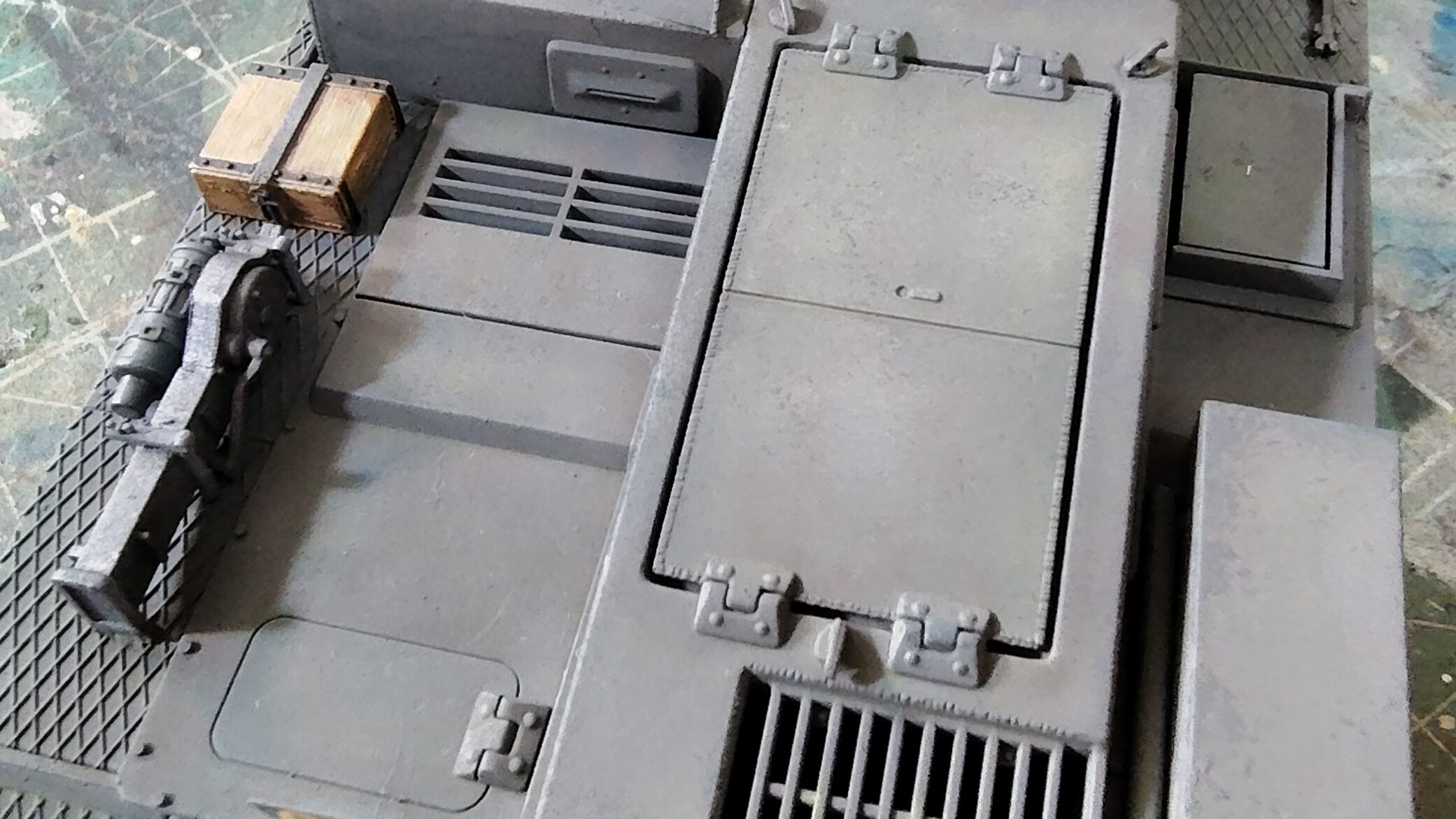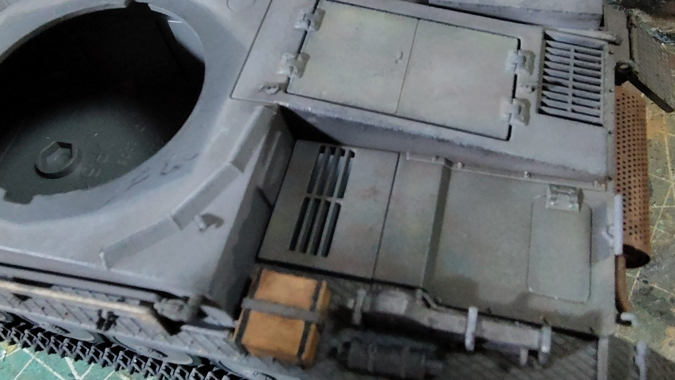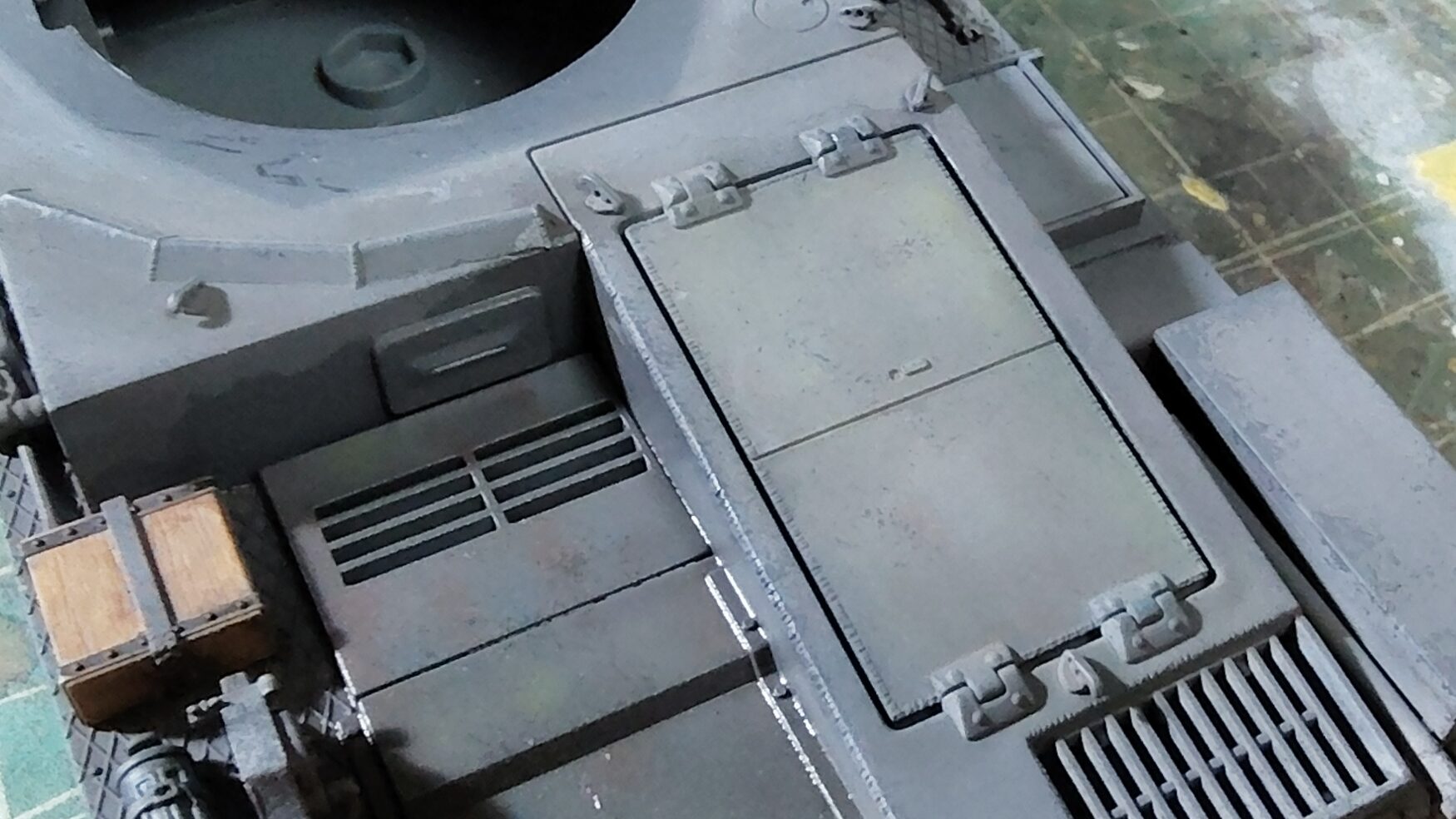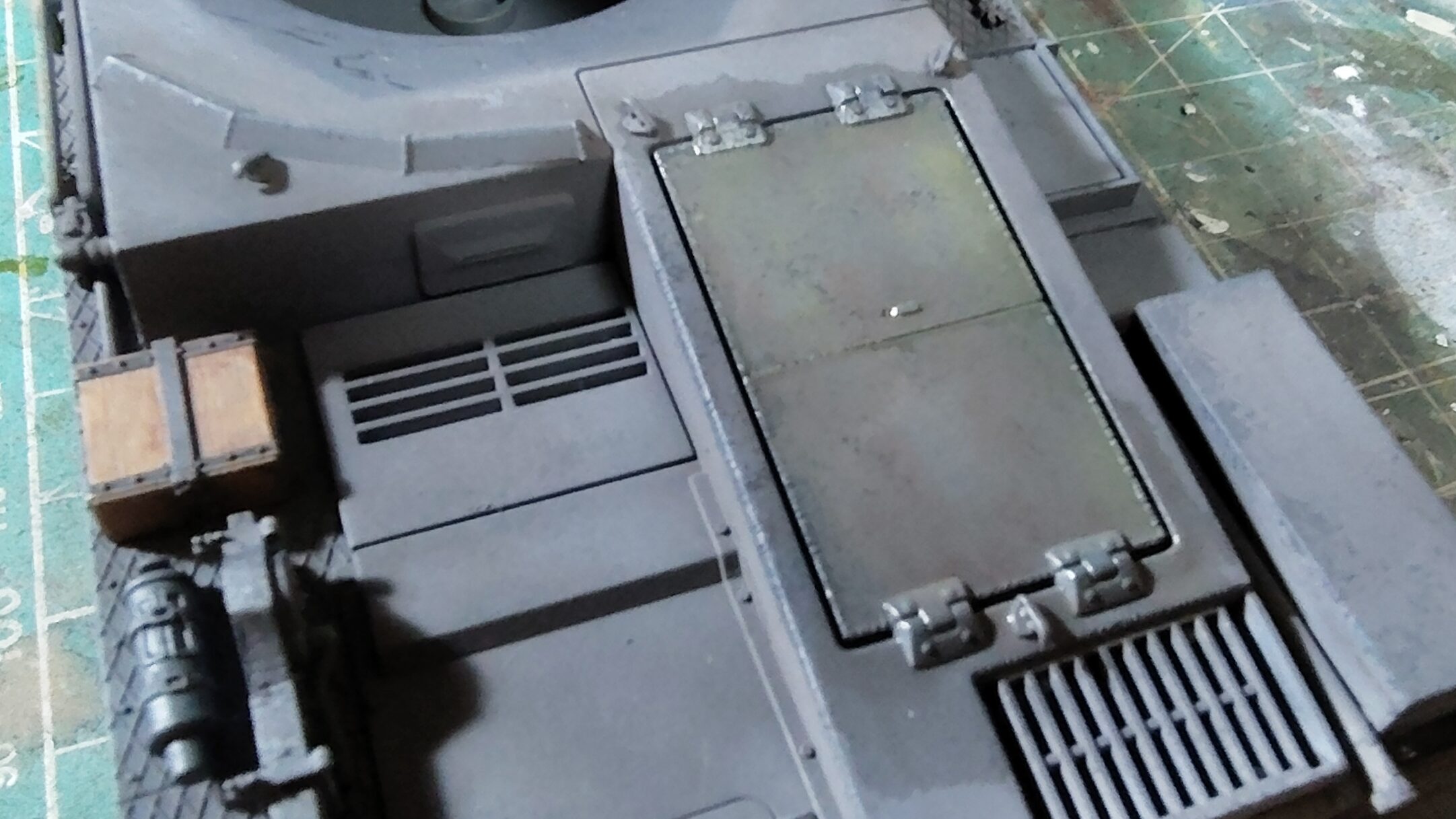 写真11はエンジンハッチと左側上面に油絵具もどき塗装を加えた状態になります。未塗装部分との差がハッキリ解ると思います。
