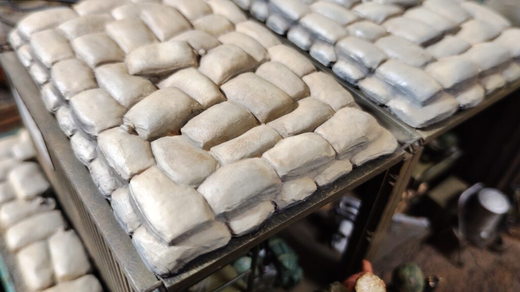 最後に上部の土嚢を写真6、7のように接着します。土嚢が浮かないように固着するまで上から軽く指で押さえておきます。