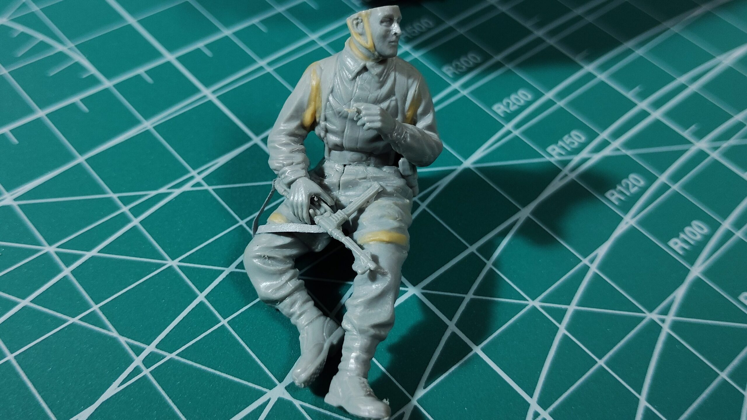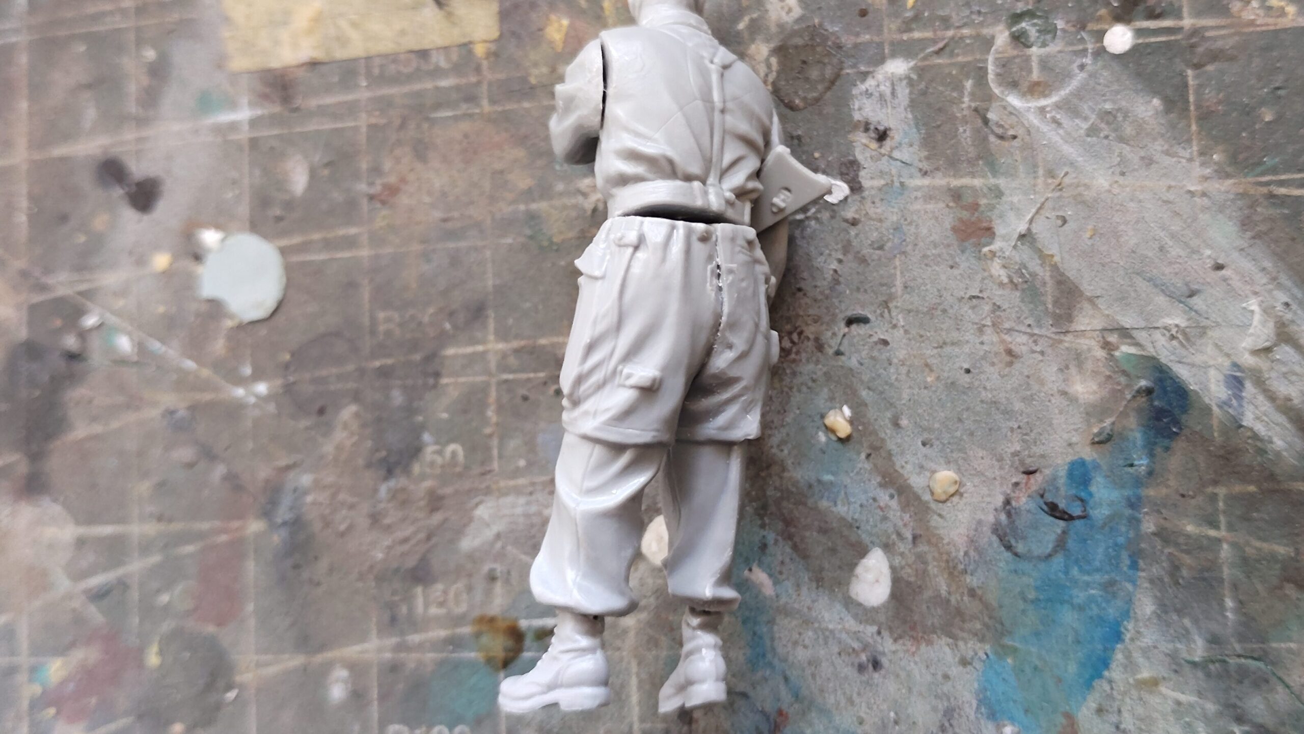 パテ盛り作業をした状態が写真3、4になります。パテを使って隙間埋めと弱い部分のモールドを強調させています。降下スモックとズボンの境目がハッキリしていなかったので、境目部分を少し強調させています。