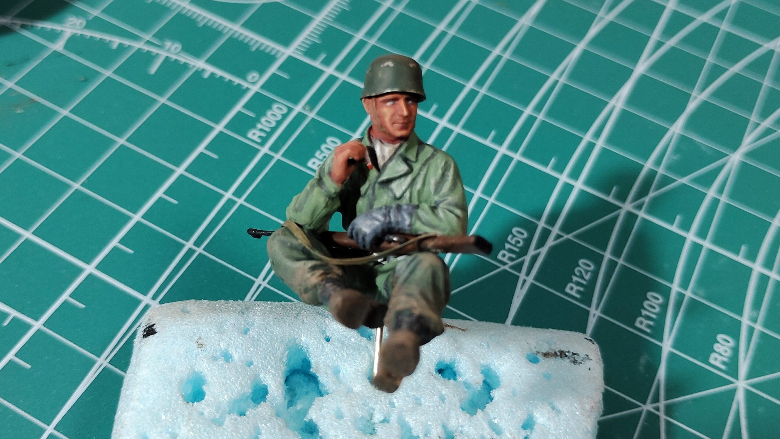 大戦後期の降下猟兵の降下スモックはスプリンター迷彩が施されています。このスプリンター迷彩はちょっと面倒で、8体のフィギュアを塗装するのはちょっと大変です。