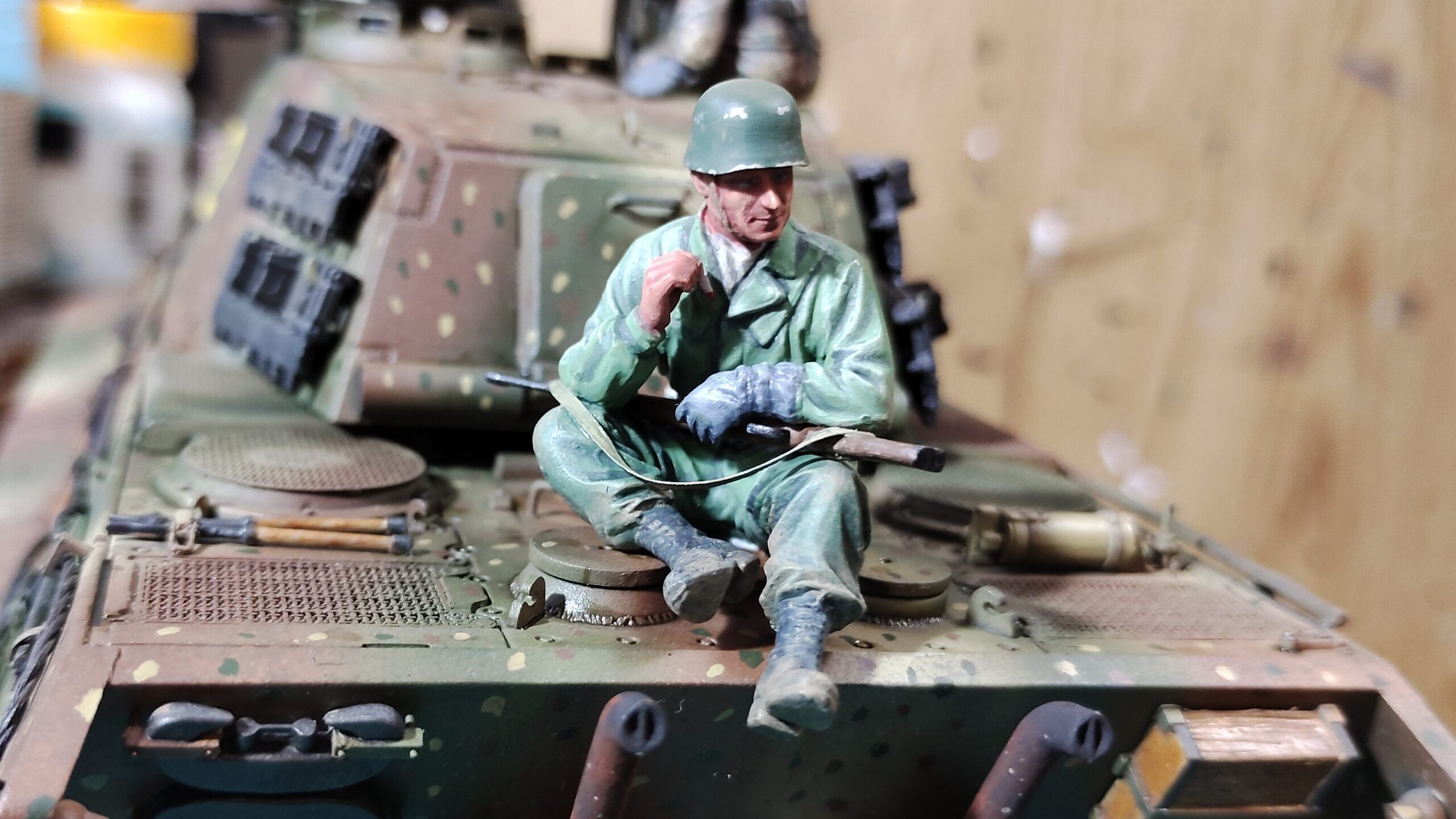砲塔左側に立つフィギュアの塗装を終えた状態が写真5、6になります。このフィギュアも迷彩柄の無い初期タイプの降下スモックにしています。