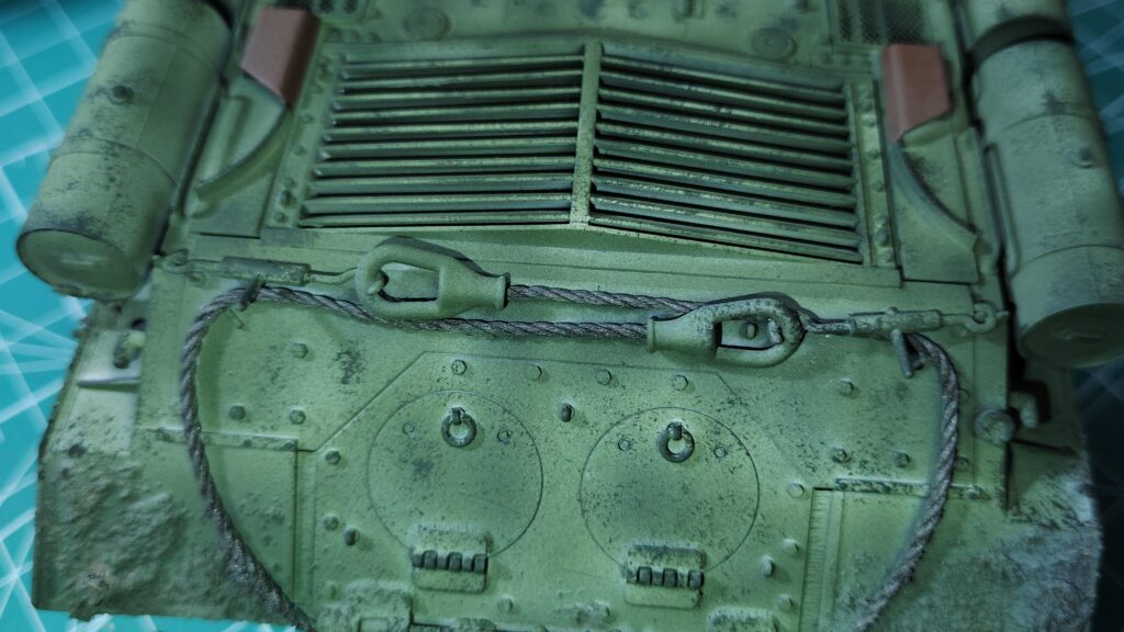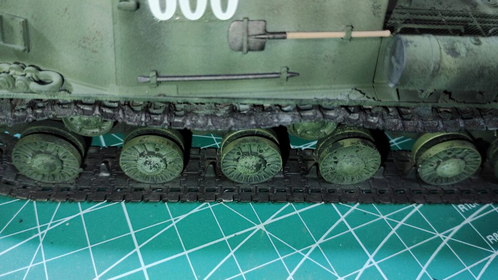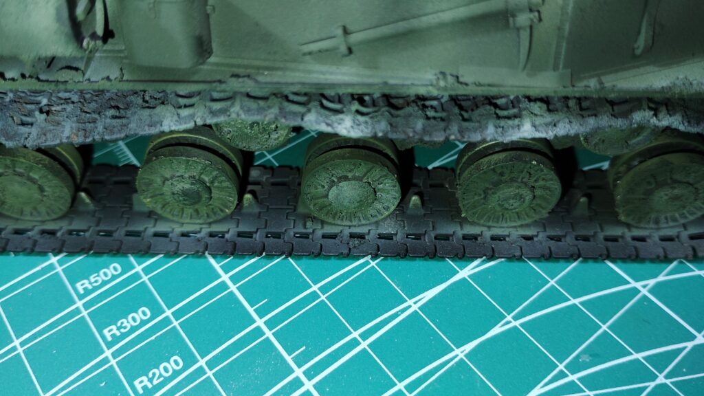 泥汚れと車体の境目は、表面処理のスミ入れ用塗料やパステル粉が溜まっていくと、いつのまにが自然な感じになります。境目は意識しないで、テクスチャー部分に色をのせる事を重点にして塗装を行います。