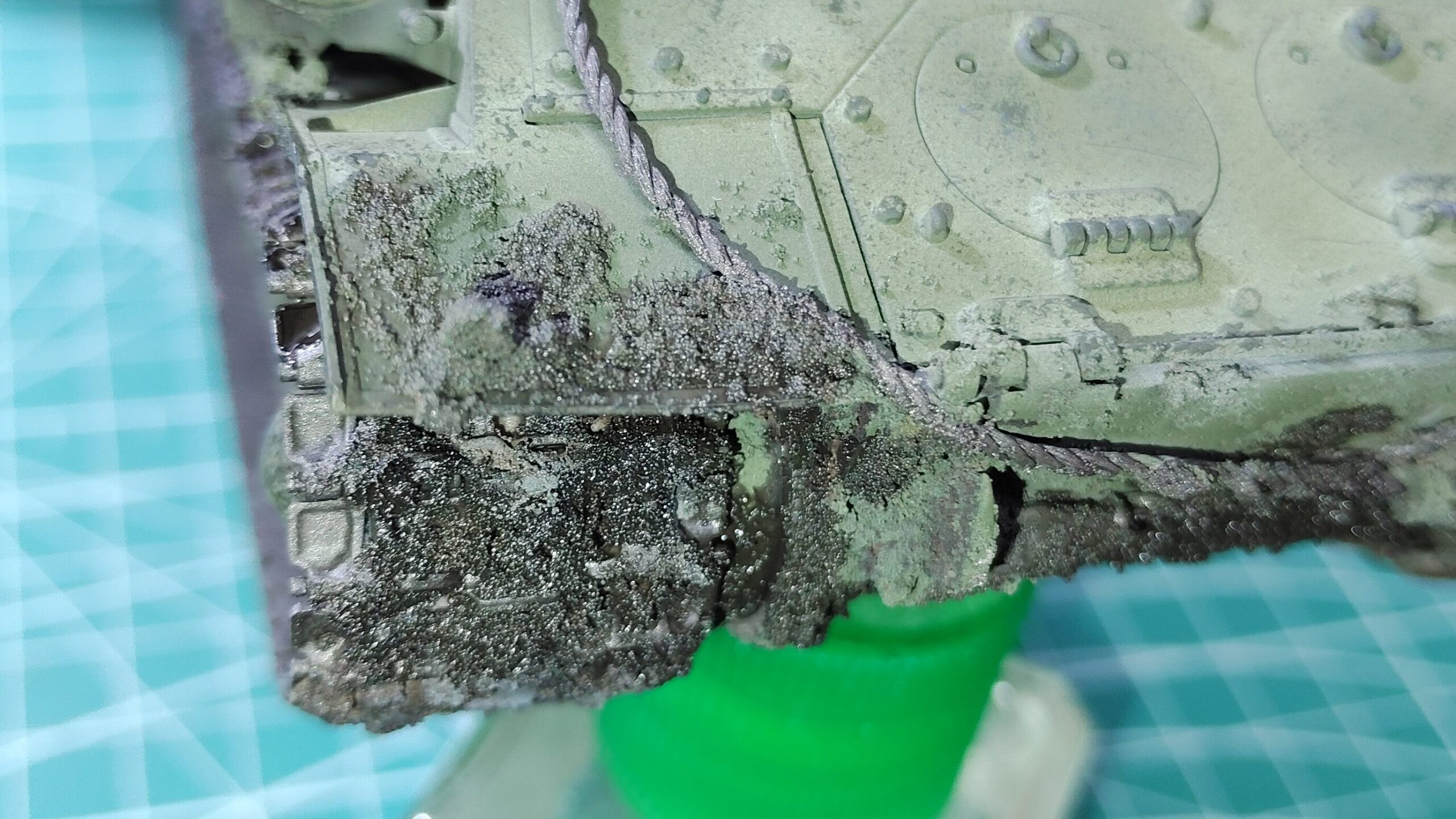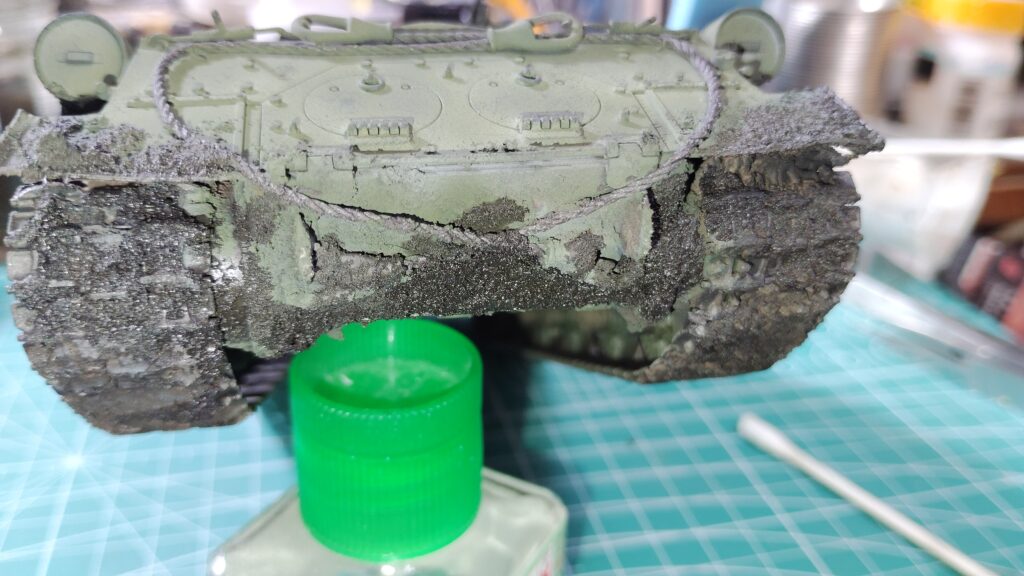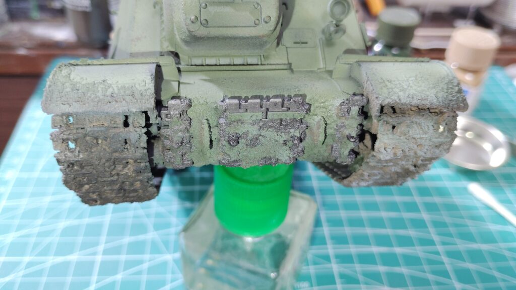 足回り部分もテクスチャーペイントを強く盛った箇所だけ塗装します。泥汚れは徐々に仕上げていくので、まずは泥汚れの下地塗装のようなつもりで、気楽に泥を盛り付けた箇所だけ塗っていきます。