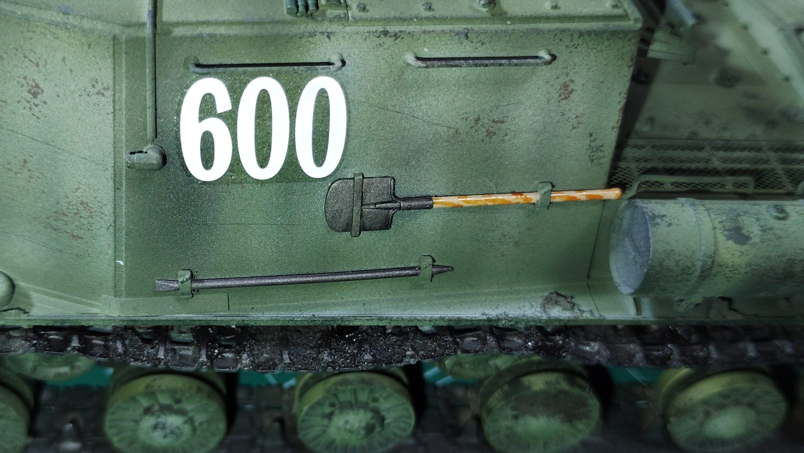 今回は車両と装備品との違いを出すため、エナメル塗料のXF58オリーブグリーンで写真4のように標棹を塗装してみました。