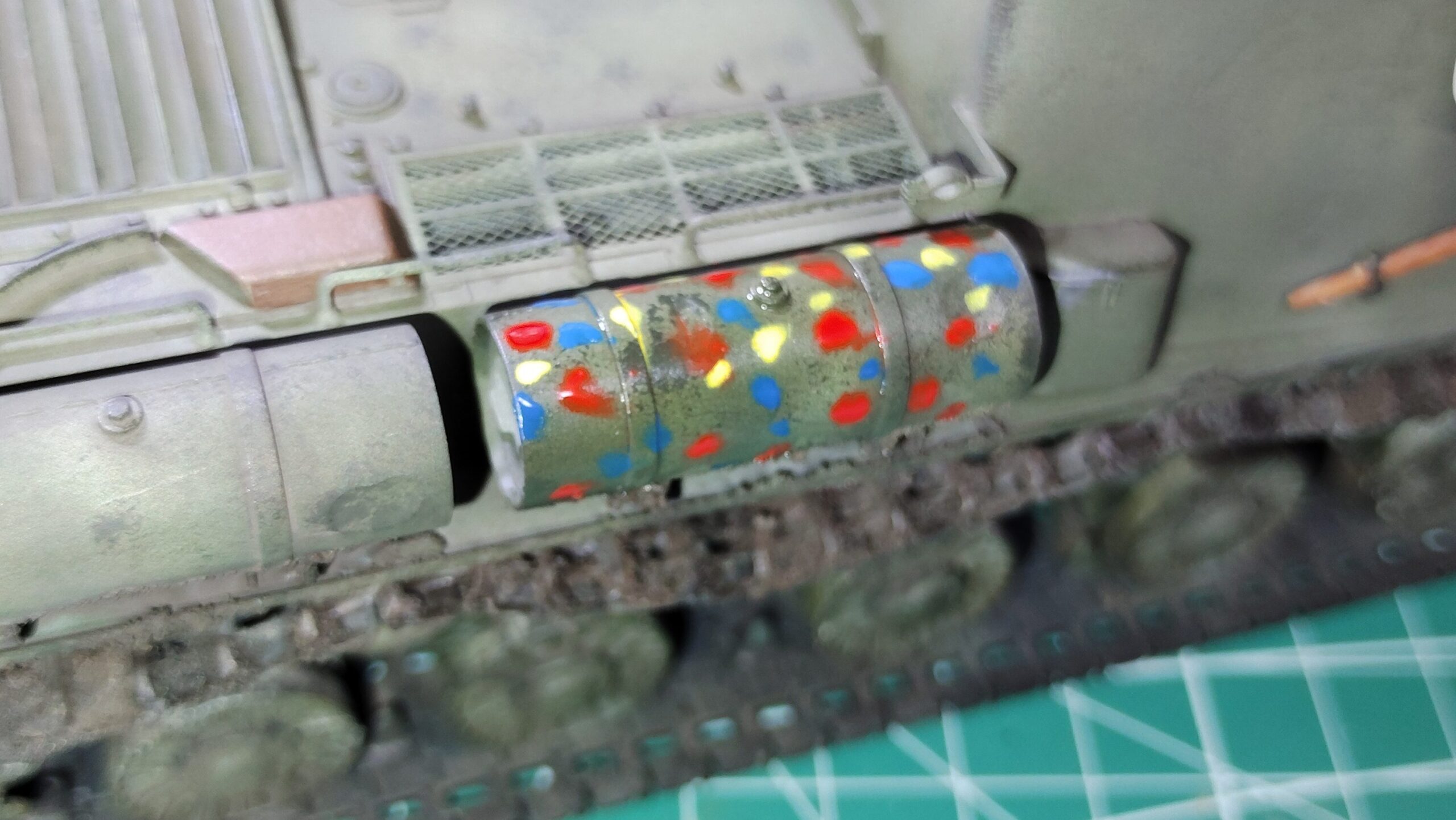 エナメル塗料での表面処理を終えた状態が写真11~13になります。車輪やキャタピラなどの足回りには表面処理を行っていません。