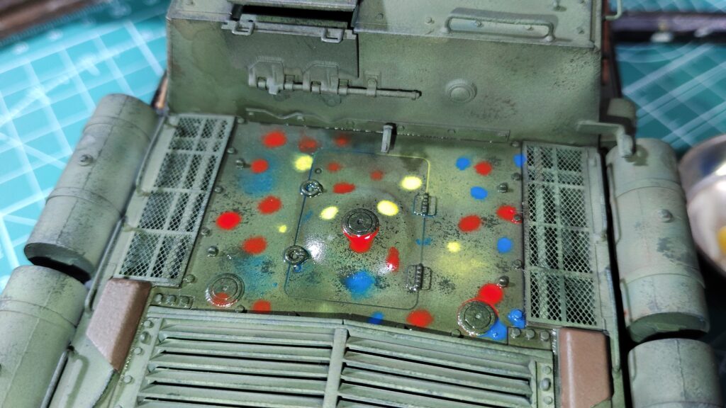 エナメル塗料を塗ったら素早くエナメル溶剤で拭き取ります。色を混ぜながら拭き取っても良いですし、混ざるのを避けて拭き取るのも良いです。もともと規則性のない経年劣化を表現するので、ランダムに赴くままに拭き取り作業をして下さい。