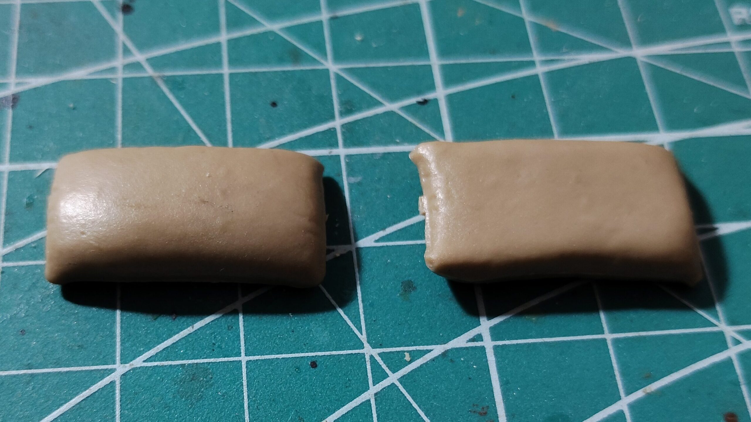 積み重ね用は上面が平らになっていて、写真2のように片側が垂れ下がって、もう一方はせり上がった状態になっています。上下左右に積み重ねる際は問題ないのですが、単品で配置すると片側がせり上がった状態になってしまいます。それはちょっと不自然なので積み重ね用を使用する際は、2個の土嚢パーツを中心で切断し垂れ下がっている側のパーツ同士を接着して、いわゆるニコイチの状態で使用する事にします。