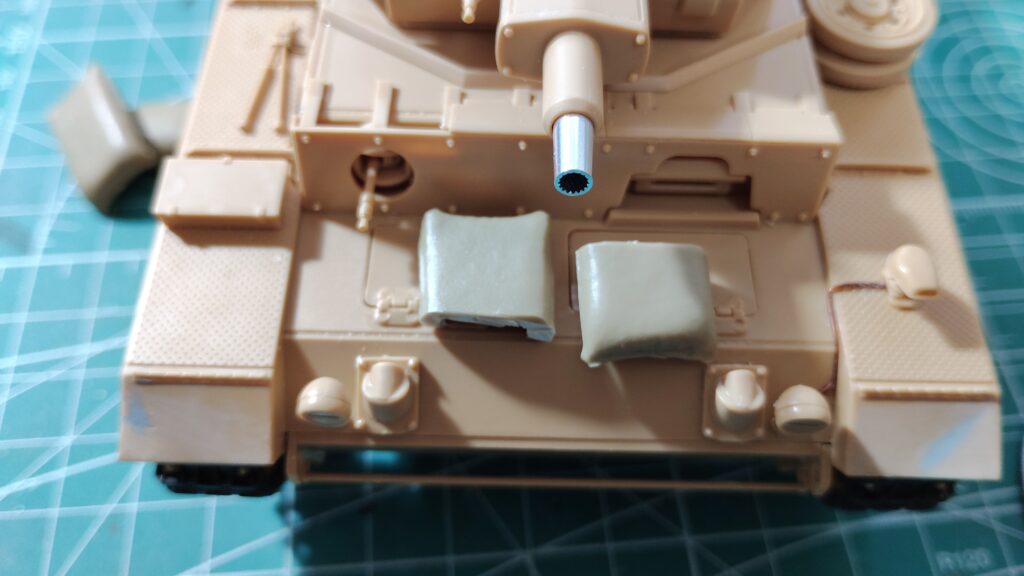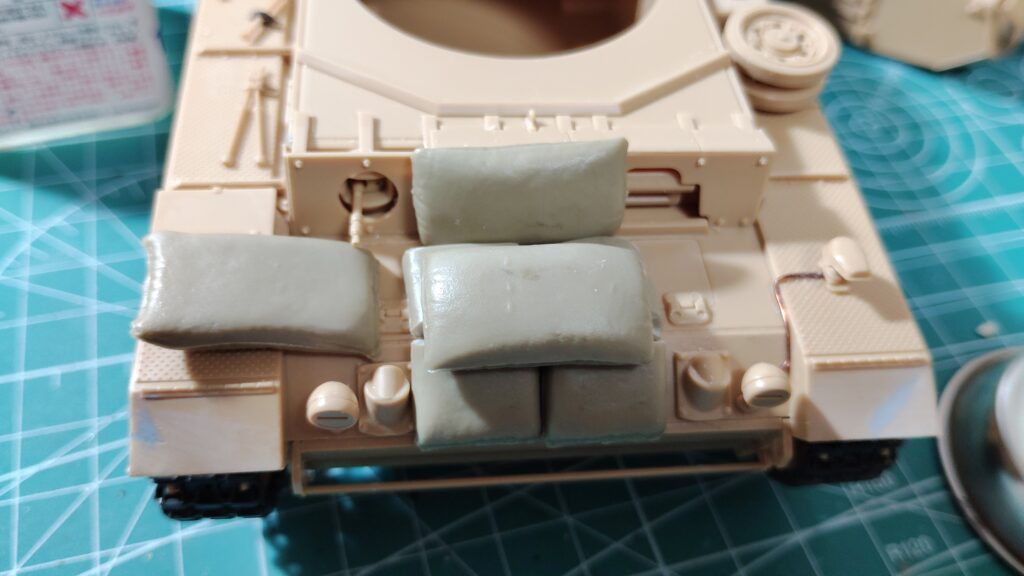 イメージ的には写真3のように配置する予定です。砲塔回転の邪魔にならない事と、操縦手バイザーからの視界を邪魔しない事を意識して土嚢の配置場所を考えます。