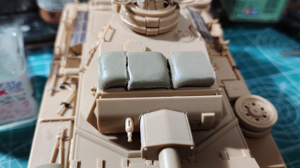 今回のように土嚢パーツを芯として使用すると、パテ盛り作業が格段に楽になります。車体に合わせて形を製作するのはちょっと大変そうですが、芯があるとフィギュア改造と同じように隙間埋めの延長のような感覚で作業できます。