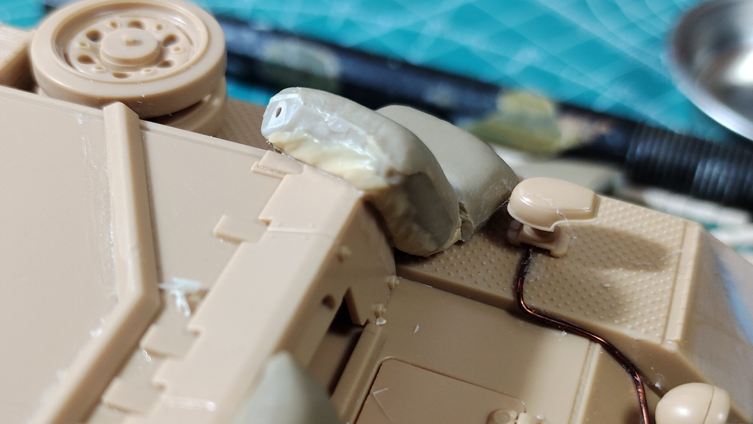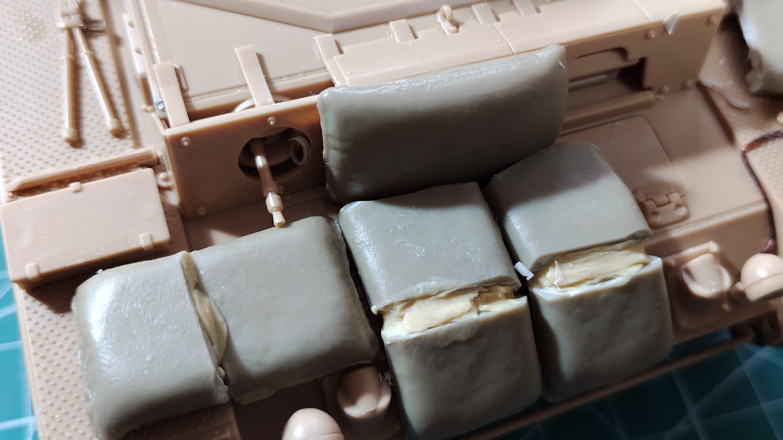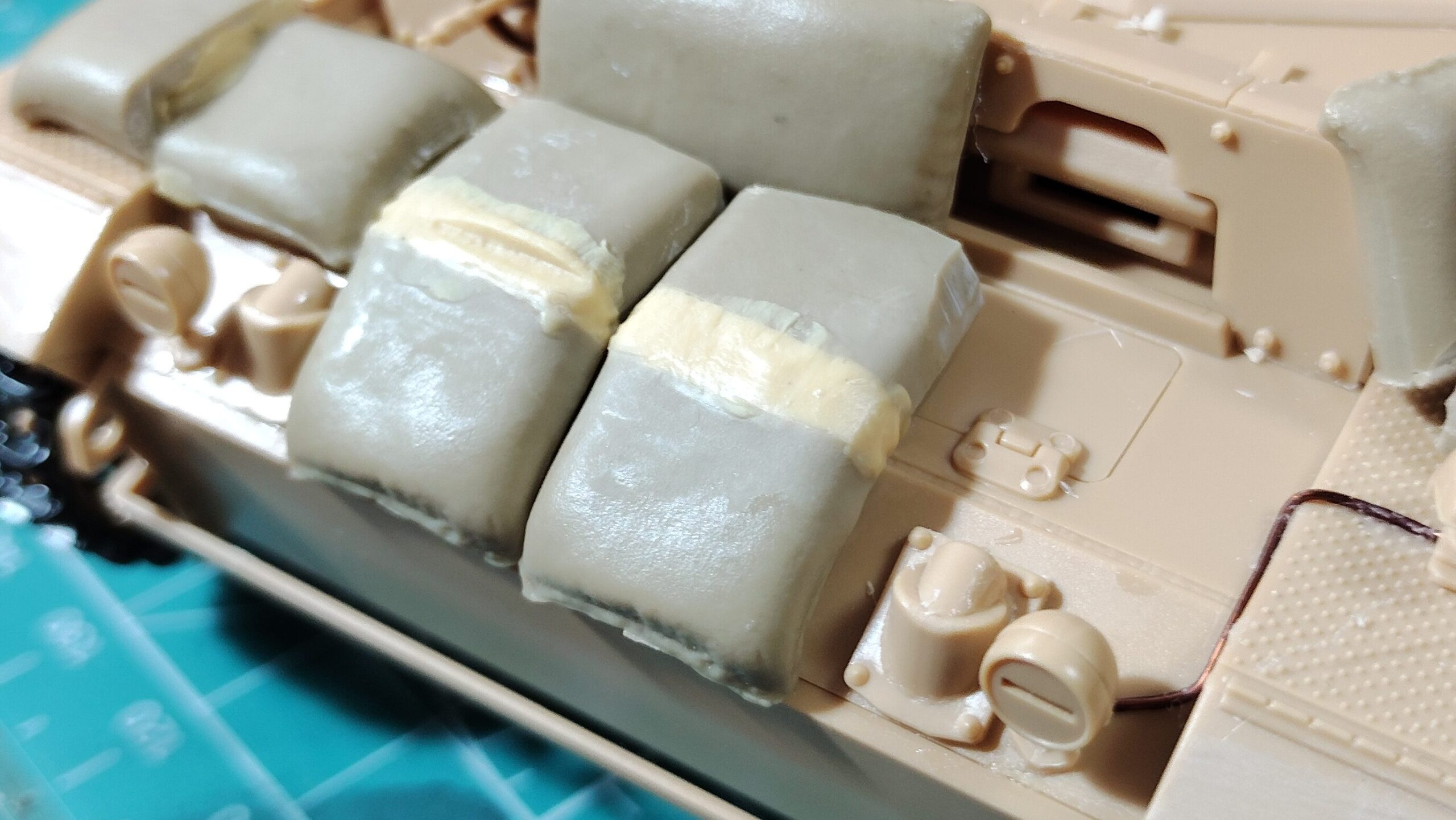 下段になる土嚢のパテ盛り作業から行います。まずは車体前部に搭載した土嚢パーツのパテ盛りを行います。ちょっと難しそうですが、土嚢の形状自体が単調なのでフィギュア改造のパテ盛りよりも簡単です。ただ、使用量が多くなるのでパテの残量には気をつけて下さい。残量に不安があると、作業自体の余裕がなくなってしまうので注意して下さい。
