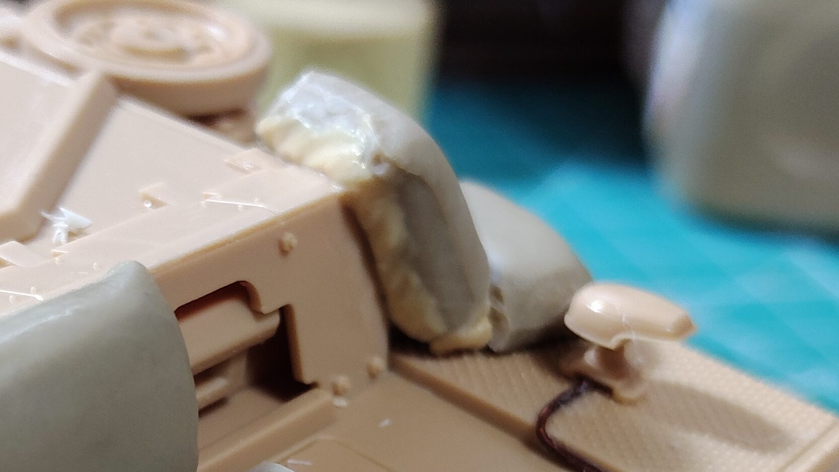 前回は土嚢パーツの接着について説明しました。今回はパテ盛り作業になります。