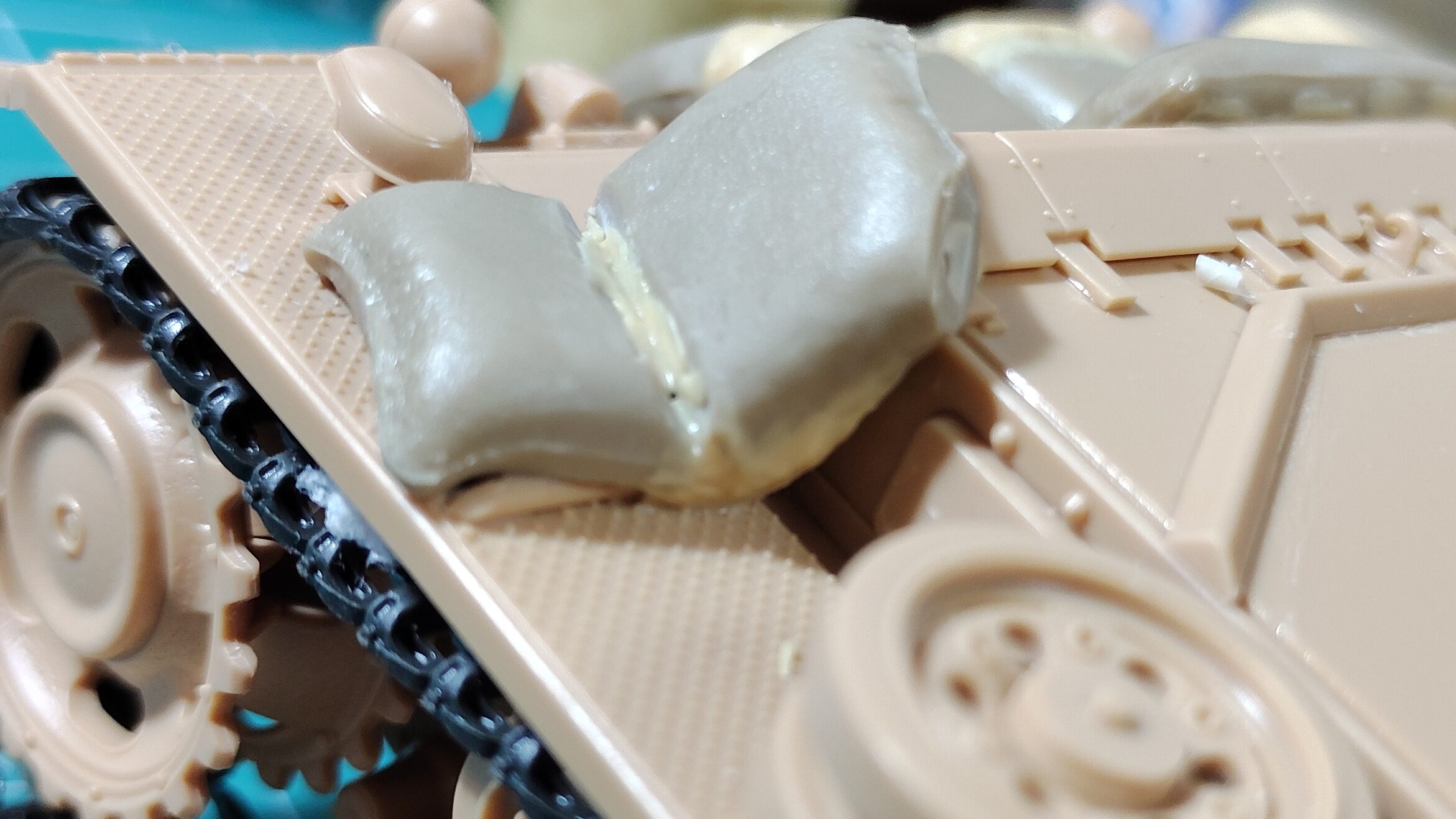 土嚢下面と車体の間に発生した隙間は、上段の土嚢を取り付けた後でまとめて処理します。隙間が発生している箇所を、パテ盛り作業をしながらチェックしてみて下さい。