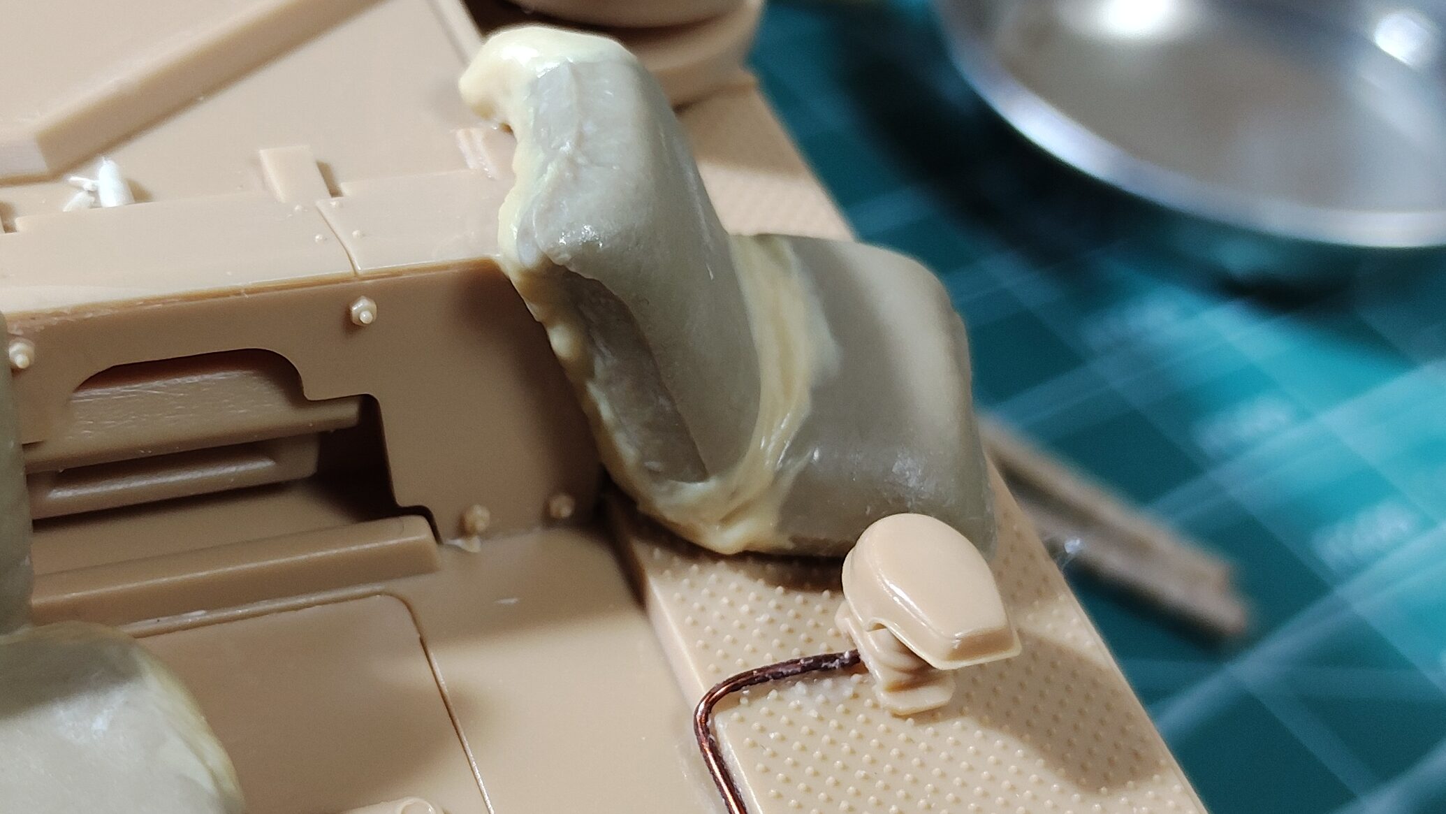 パテを盛り付けたら、パテ盛りした面をラッカー溶剤を付けた筆で撫でて表面を滑らかにします。表面を軽く溶かすので硬化時間は通常よりも長くなりますが、表面が滑らかで柔らかい感じに仕上がります。パテで布などを表現する際は、参考にしてみて下さい。