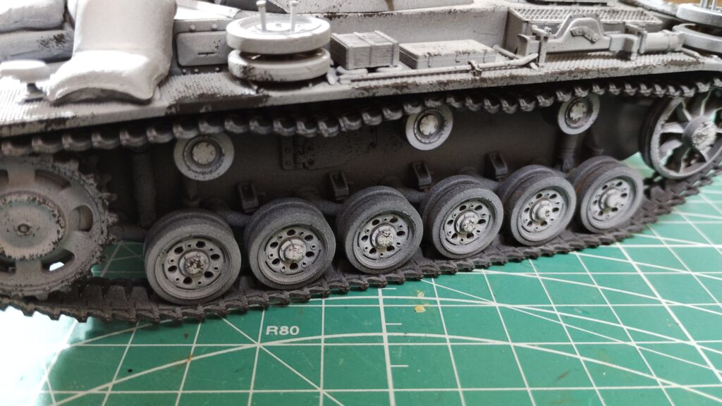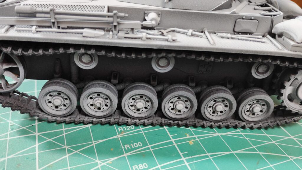 キャタピラ部分はあとで修正塗装をするので、白がかかっても問題はないです。はみ出しは気にしないで、強調させたい部分に白を吹き付けて下さい。