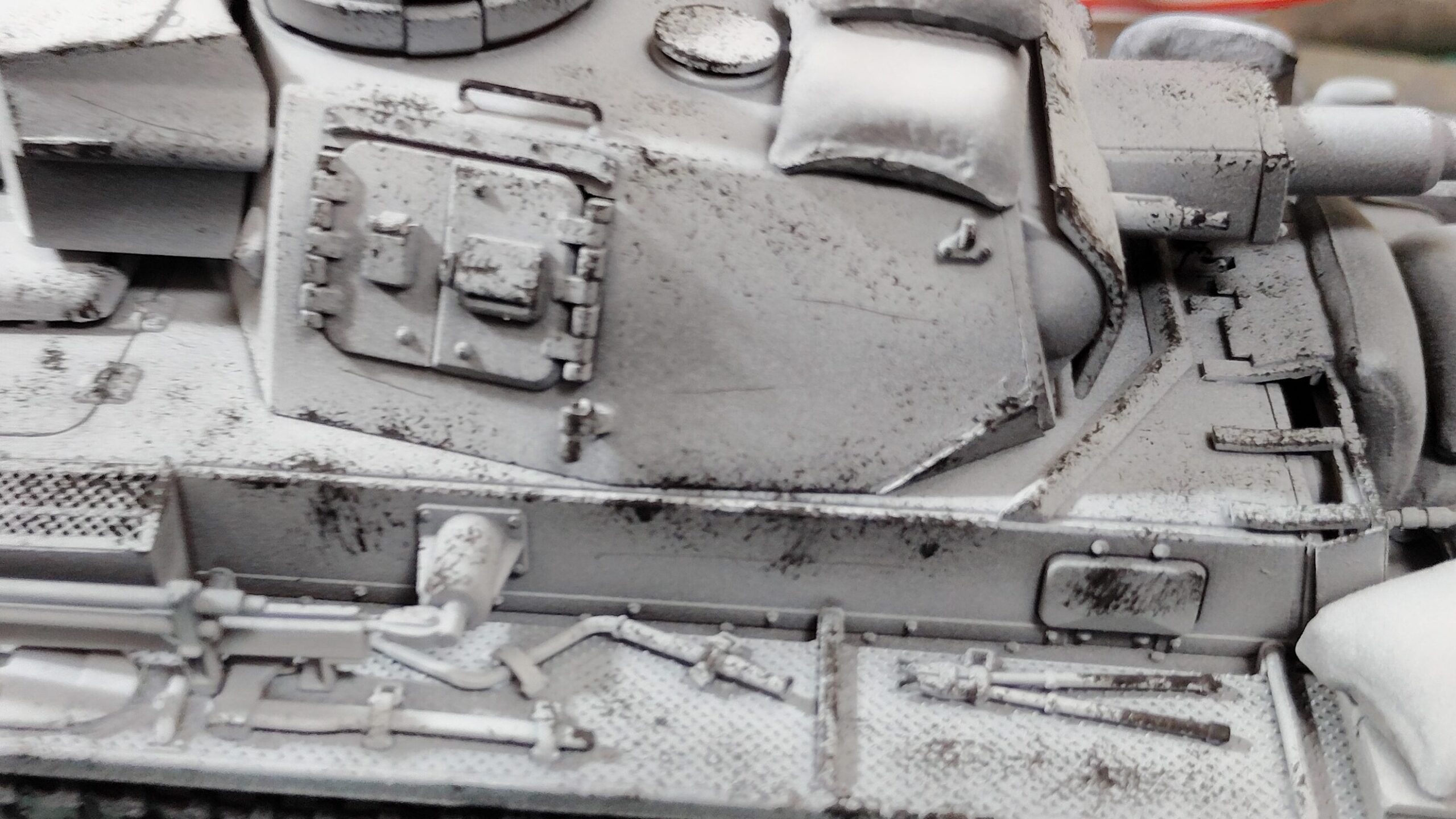砲塔の影になる部分は黒塗装を残したいので、砲塔を取り付けた状態で白塗装を行います。砲塔の影を残したい場合はフィギュアなどを配置して、砲塔の向きを確認してから白塗装をするようにして下さい。木工用ボンドの点付けなどで、軽く固定しておくと塗装中のズレを防ぐ事ができます。