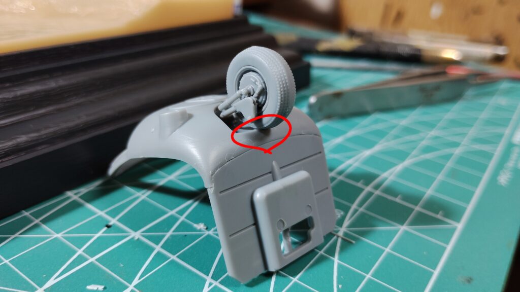 前輪はかなり不安定なので、写真3の赤丸部分で車体と接着して安定感を上げています。この部分は車体と前輪の隙間が少ないので接着しても目立たないです。前輪をフレームのみで支えるのはちょっと不安なので、強度が気になる人は前輪の一部を車体に接着する事をお勧めします。