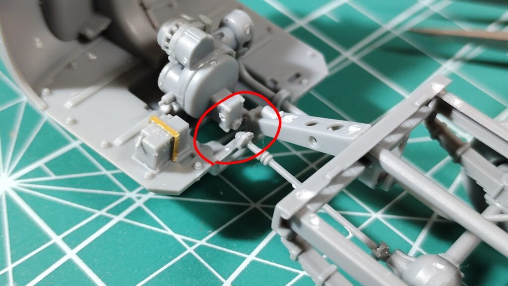 後輪の駆動シャフトはやや短かめで、取り付けられないというわけではないですが安定感がいまいちだったので、写真4の赤丸部分のように取り付け部分を変更して、車体のフレーム部分に接着しています。この部分は荷台に隠れてしまうので、取り付け位置をズラしても解らないです。三輪自動車は強度的にやや不安定なので、できるだけじっかり固定できるように組み立てをしています。