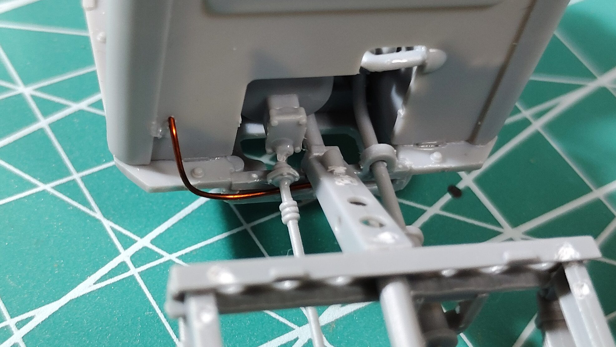 説明書ではコード類を伸ばしランナーで製作するように指示があるのですが、曲げ加工が複雑な箇所は写真5のように銅線を使用した方が加工しやすいです。写真5の部分はほとんど荷台で隠れてしまうし、前輪部分のコードはあまり目立たないので、ちょっと難しいと感じるなら無理に行う必要はないと思います。
