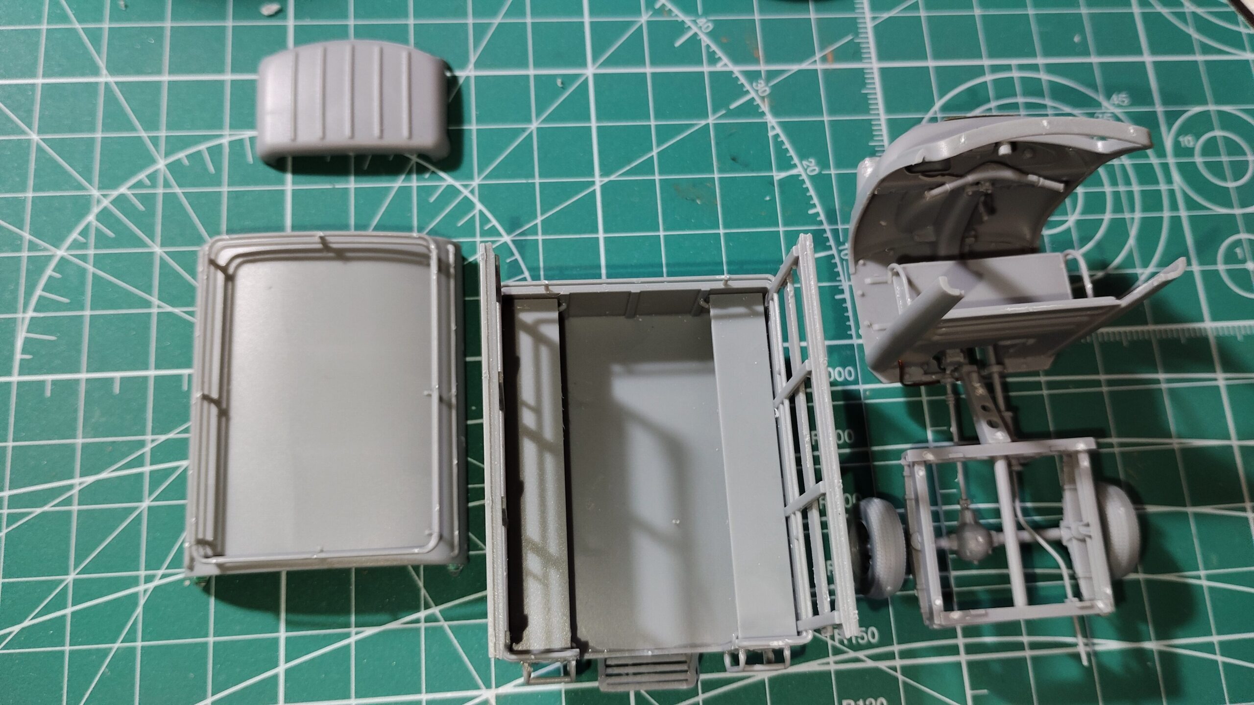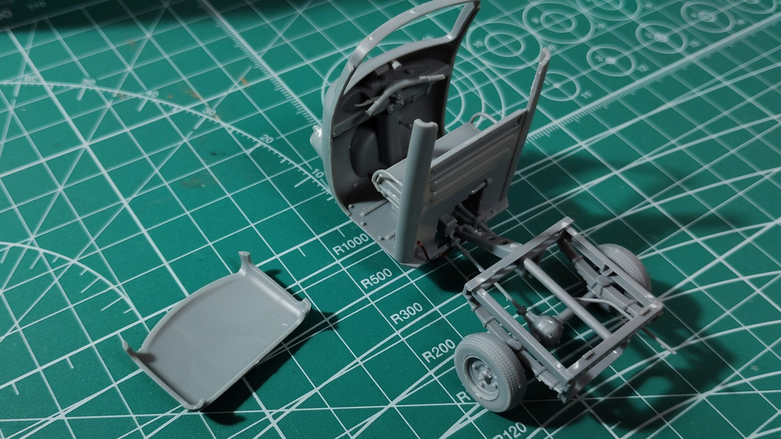 配置場所を決めるために先に三輪自動車を組み立てます。塗装の事を考えて、分割した状態で組み立てる事にしました。