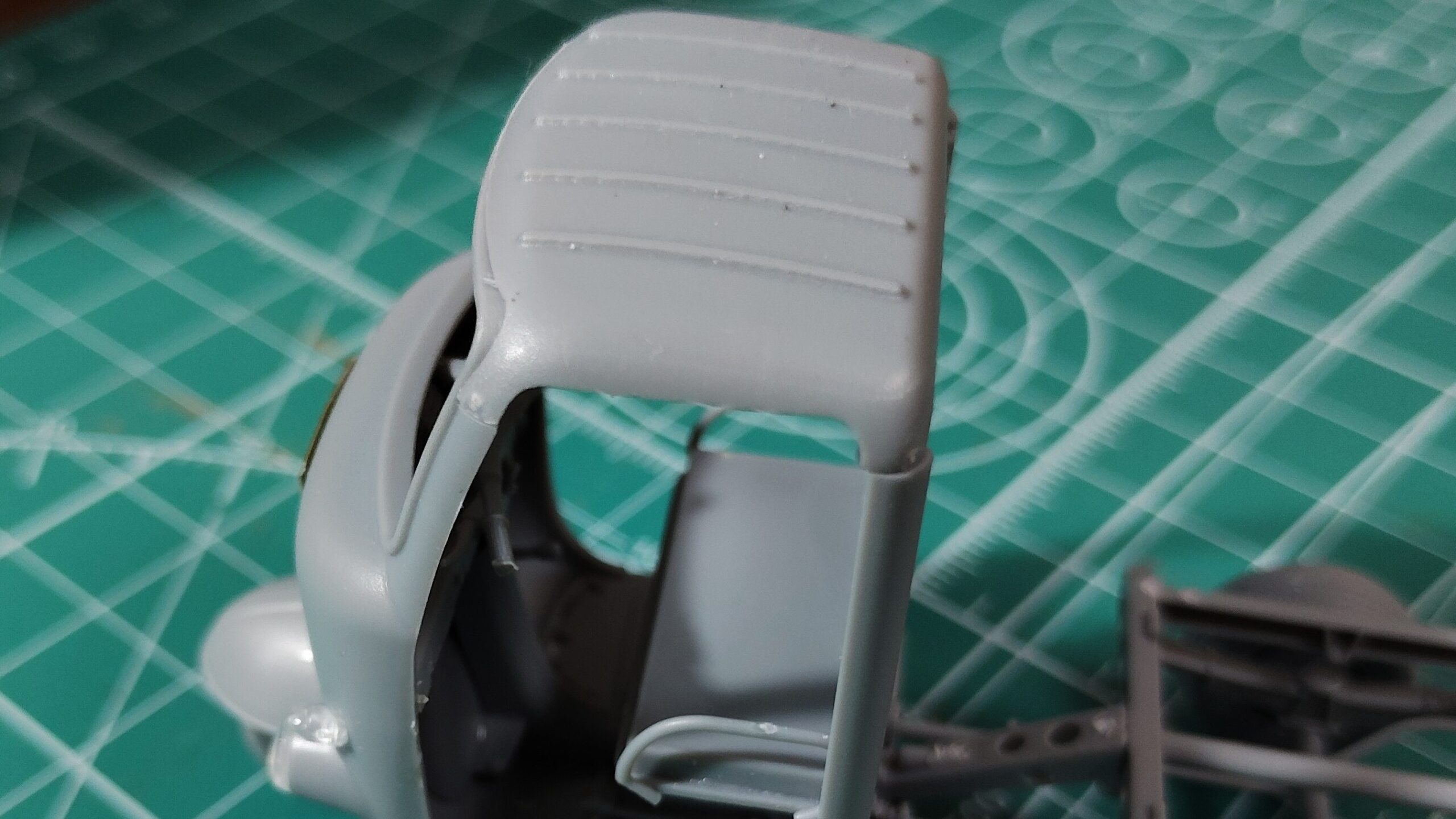 天井を取り付けてしまうと運転席の塗装が難しくなるので、写真7のように天井を外した状態で運転席の塗装をしてから接着する事にします。合わせ目処理は天井の接着時に行います。フロントガラスは外側からはめるタイプなので、これも塗装が終了してから取り付けます。