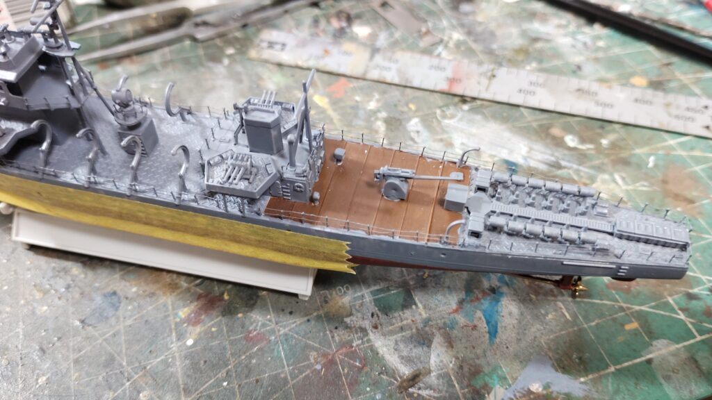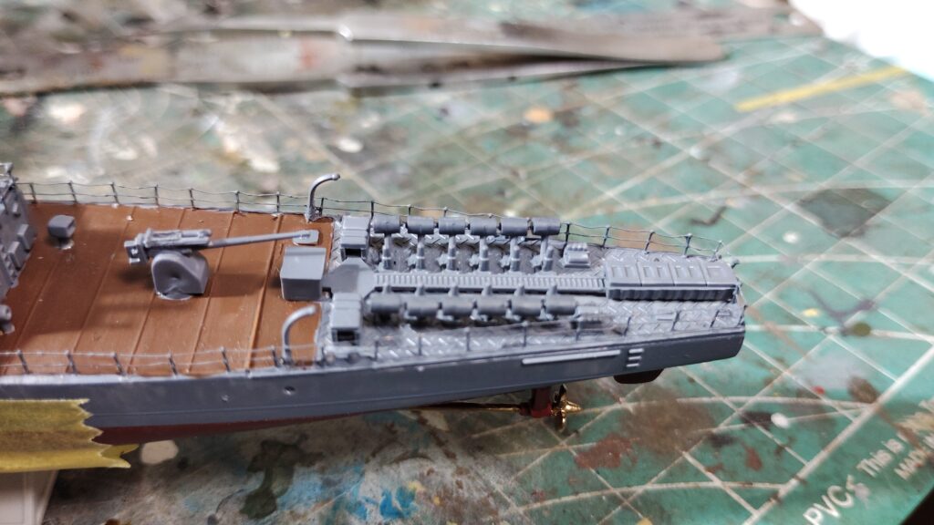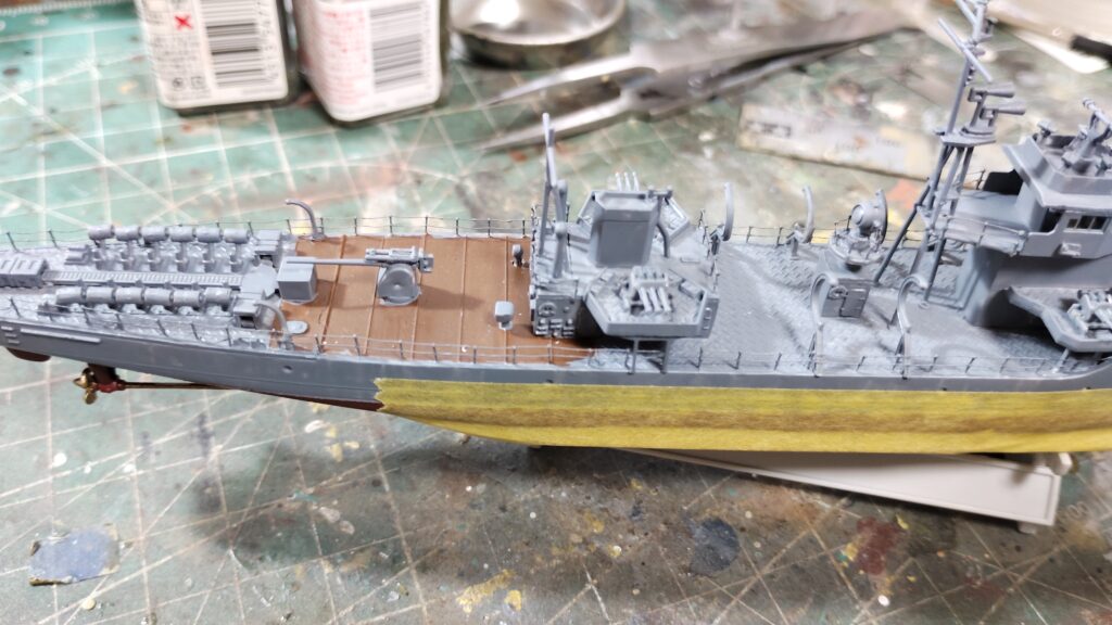 1/700スケールなら全体に船体色を塗った段階で完成にしても問題ないのですが、1/350スケールだと船体色を塗るだけではちょっと物足りないので細部塗装が必要になります。