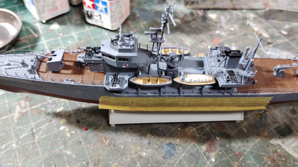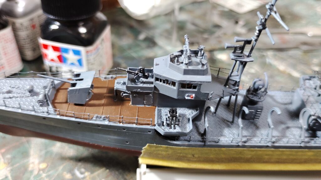 救命浮き輪やホーサーリールの紐部分も塗り分けをします。救命浮き輪は1/350でも細かいモールドなのでちょっと大変ですが、ここも良いアクセントになるので塗り分けてみて下さい。
