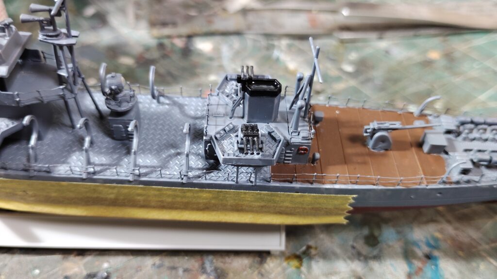 単調になるのを防ぐため機銃台座の弾薬箱を、船体色よりも少し暗めのグレーで塗装しています。本来は船体色で問題ないのですが、ちょっと色の変化を加えたかったので色を変えてみました。単調になるのが気になる人は、弾薬箱のようなちょっとした小物を塗り分けて色の変化を出してみて下さい。