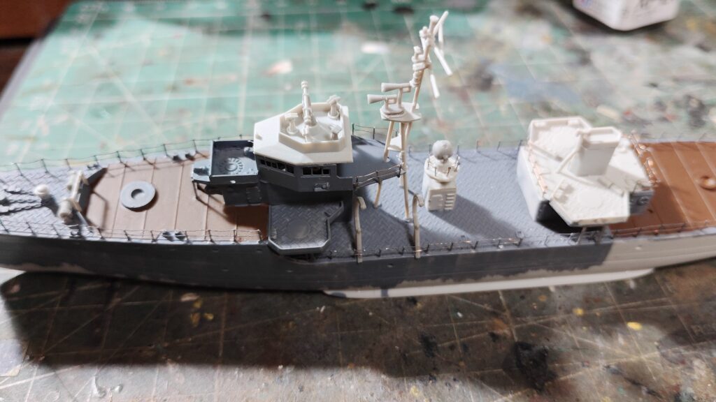 艦橋を組み立てた状態が写真1になります。艦橋の組み立て後に甲板を塗装するのはちょっと大変そうだったので、先に甲板のリノリウム部分を塗装してから艦橋を取り付けています。
