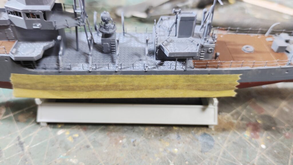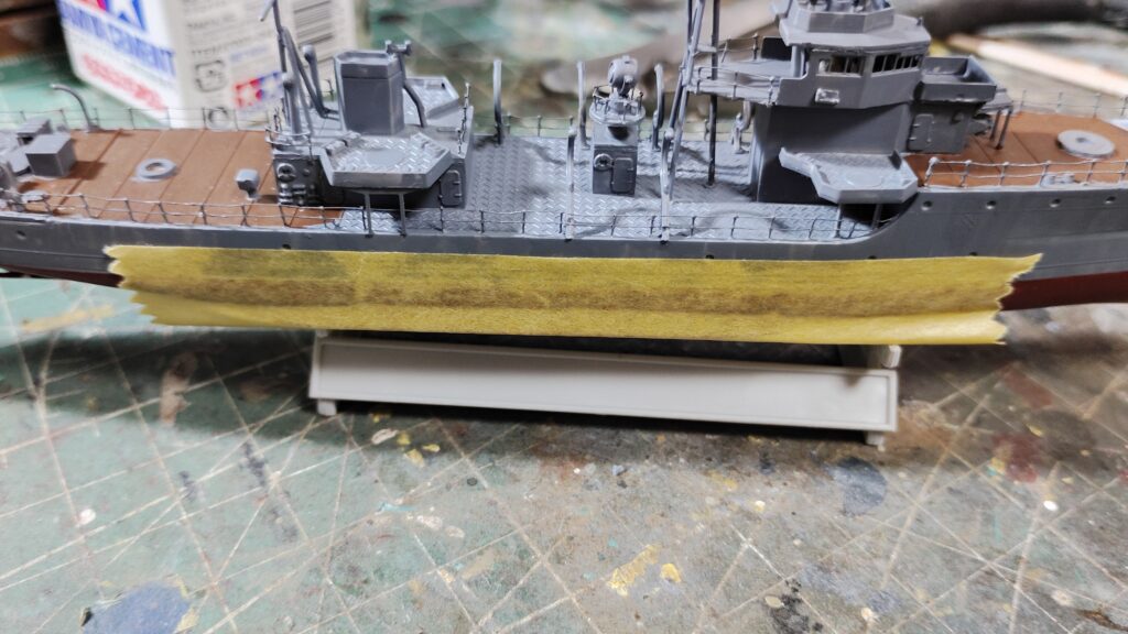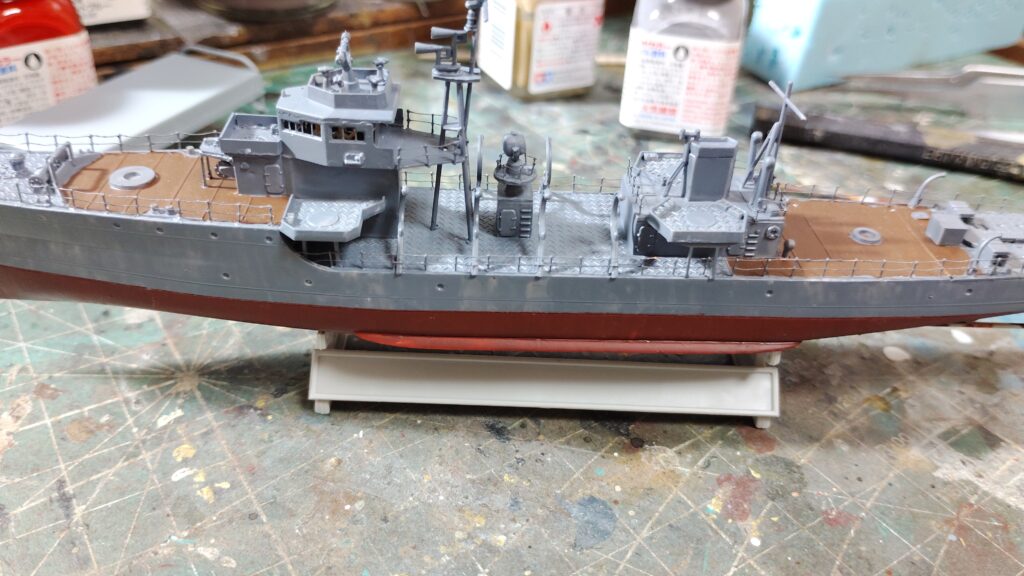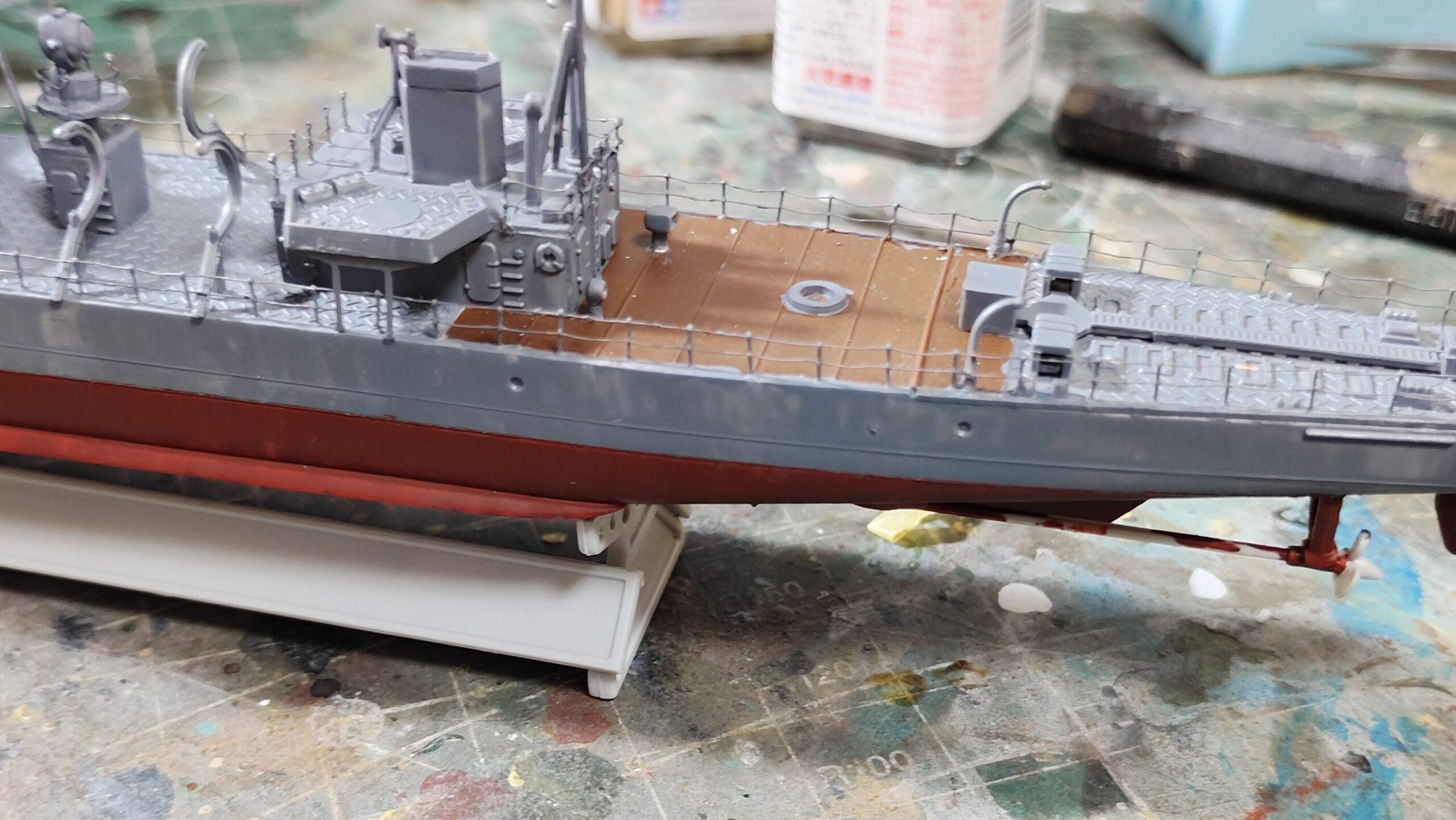 艦が大型になるほど船体側面や甲板が単調になりやすくなるので、単調になるのがイヤな人は筆塗りで汚れの流れを表現してみて下さい。