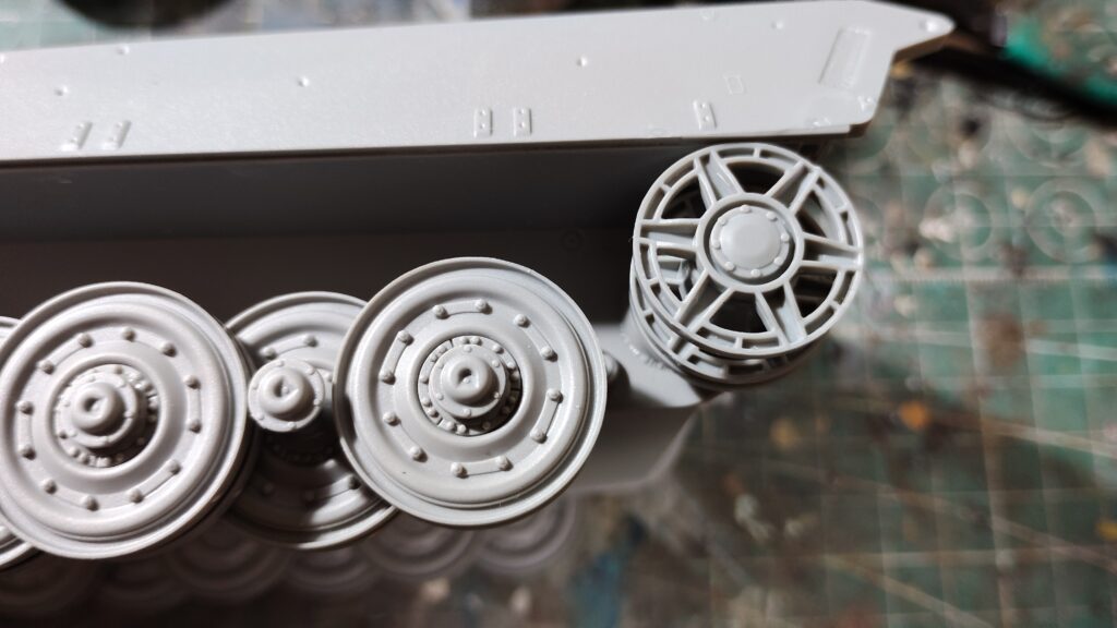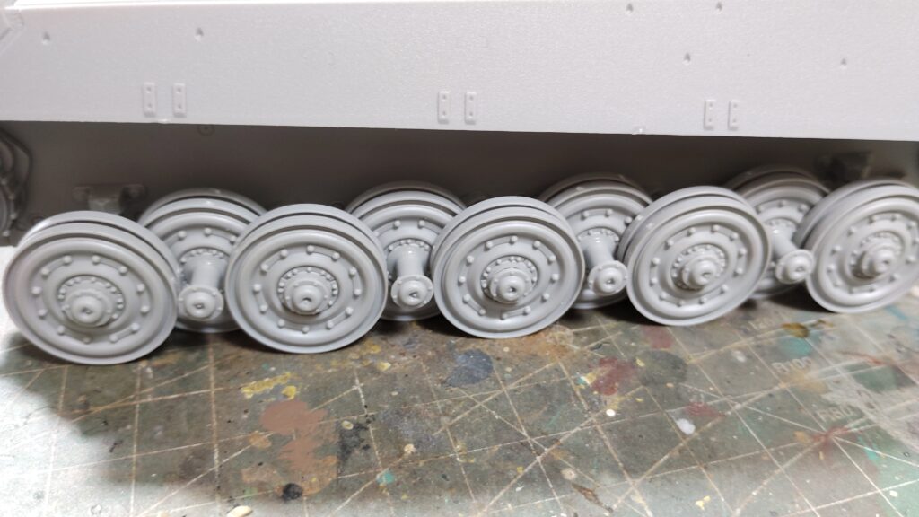🐥Ⅳ号戦車のような上部転輪があるタイプは、上部転輪ごとにキャタピラ分割して弛みを表現します。