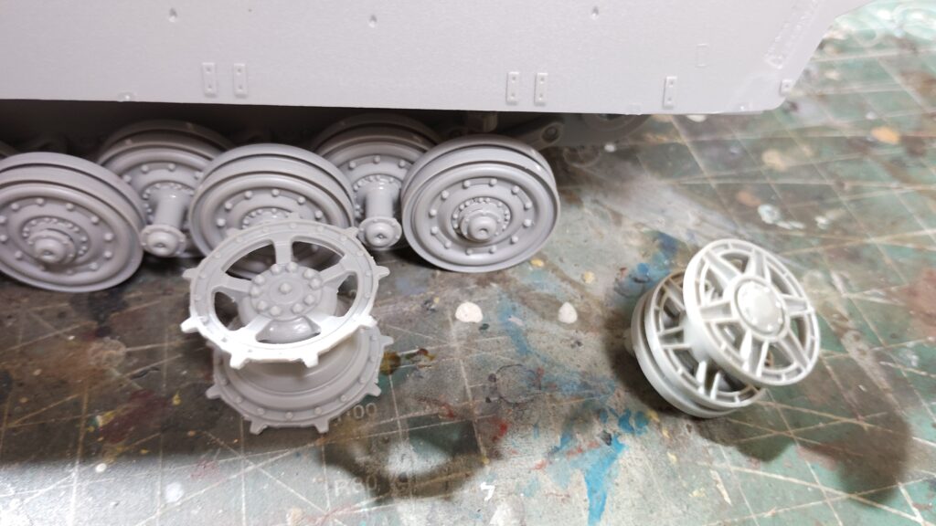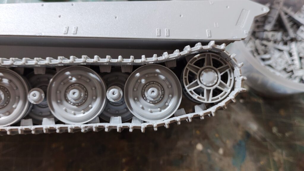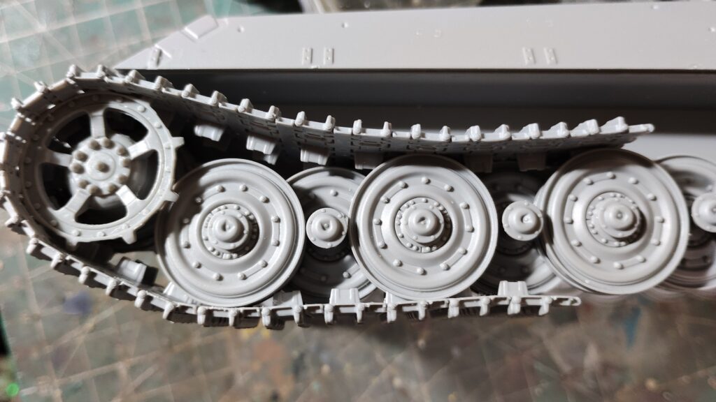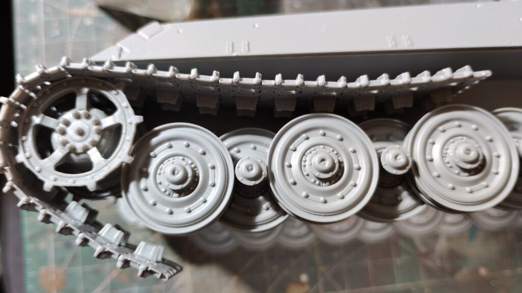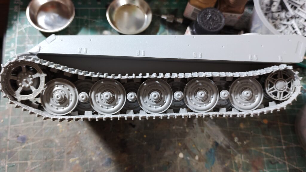 私は基本的に可動式でも軟質製素材でも、キャタピラは車体に取り付けた状態で塗装をしています。このブログの製作記事は全てキャタピラを車体に巻き付けた状態から塗装を始めているので、気になった人は他の製作記事もちょっと読んでみて下さい。