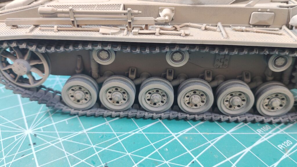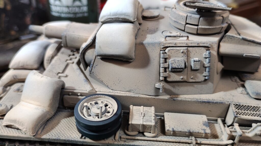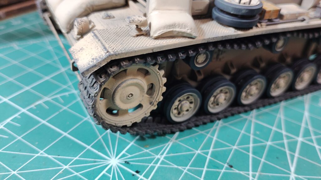 キャタピラに基本色がはみ出してしまいましたが、基本色が埃っぽい色なので砂ぼこりのようにも見えます。この後で修正塗装をしますが、汚し塗装を加えるならこの状態でも十分だと思います。